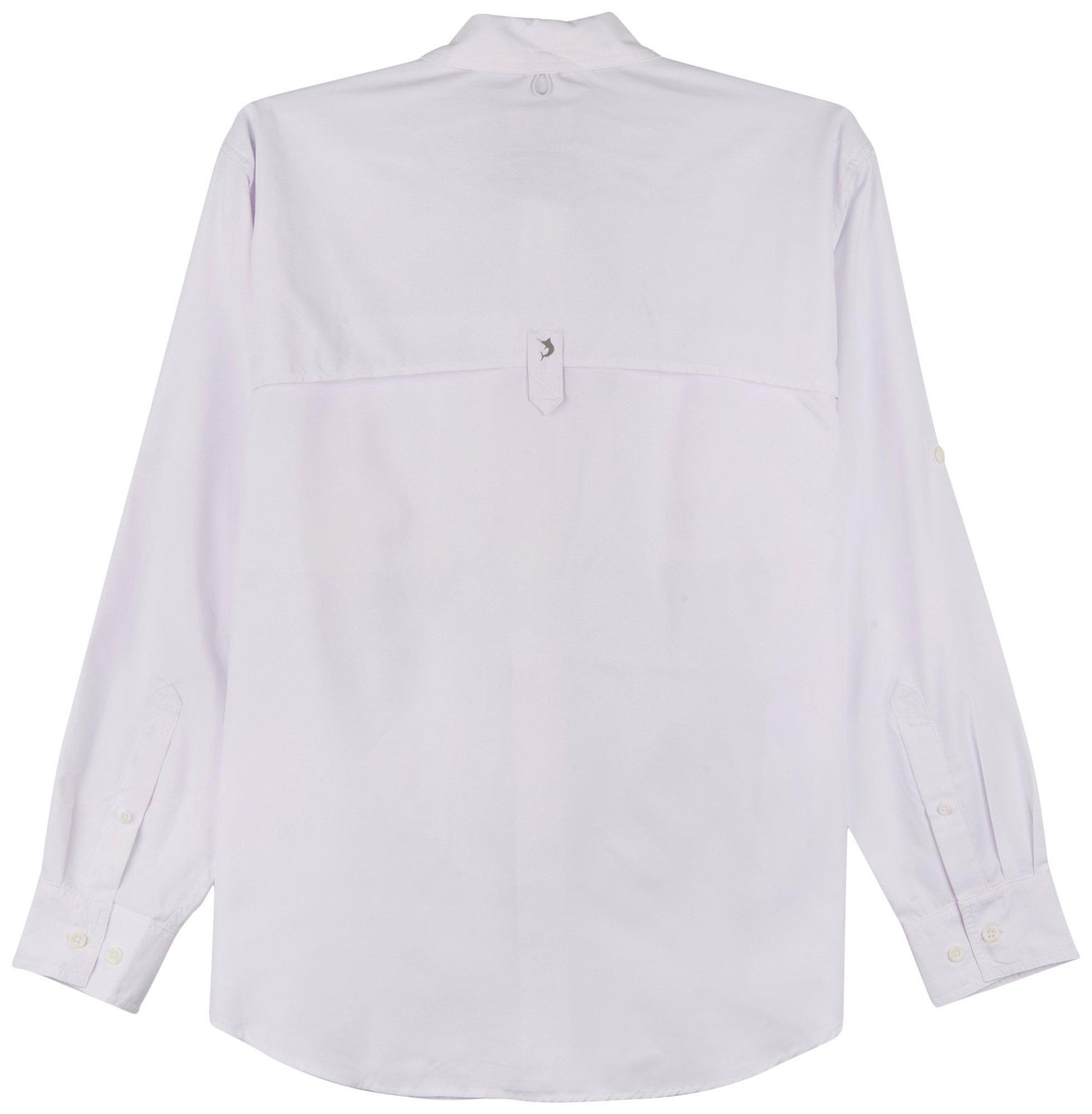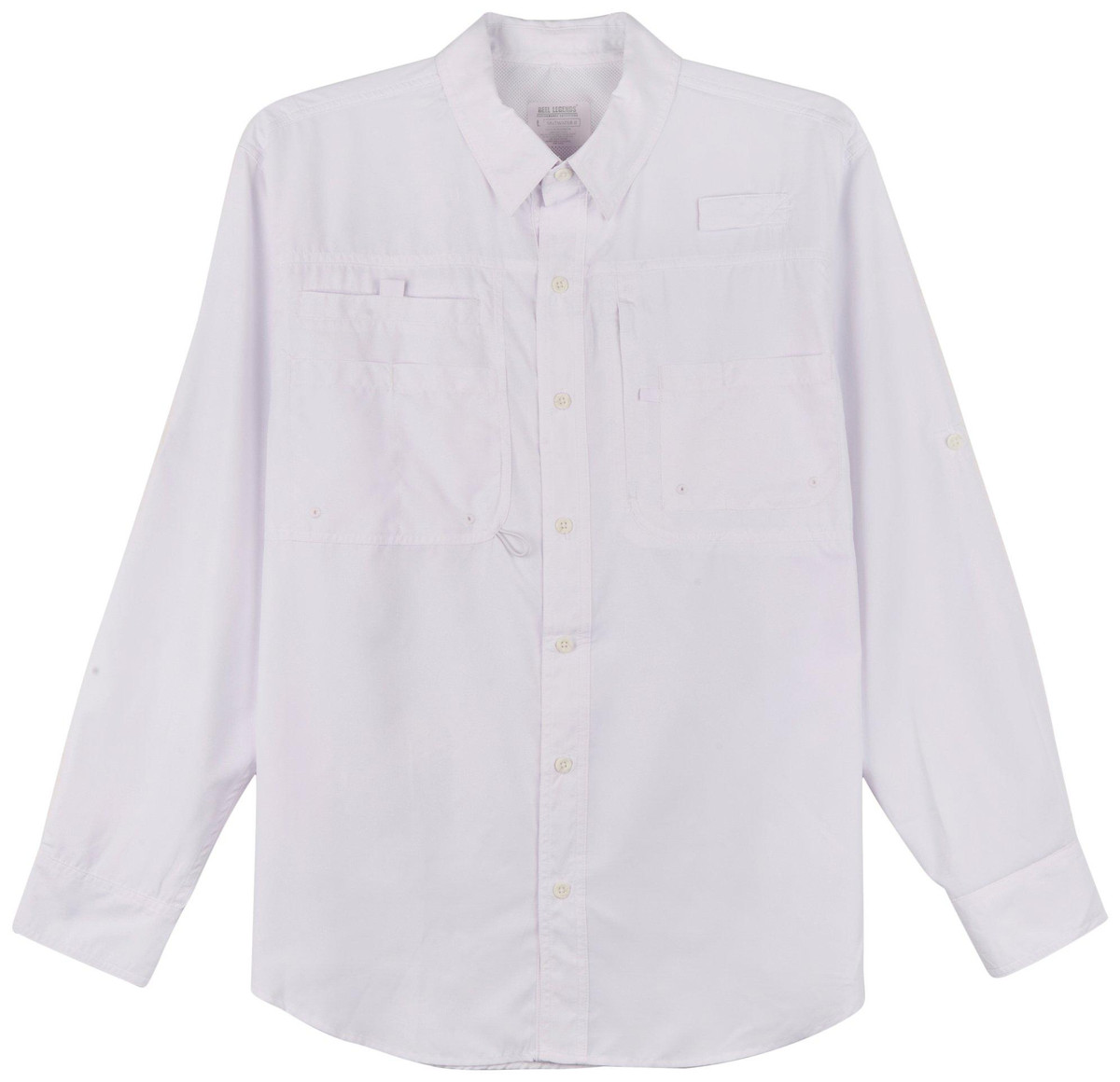 This Salt Water II long-sleeve shirt from Reel Legends features a solid color design on lightweight woven fabric, a point collar, button front closure, a fully vented back and underarm panel to keep you cool, two front utility chest pockets, a rod holder, UPF 50 sun protection, and moisture-wicking and quick-dry technology. Fabrication 100% polyester.