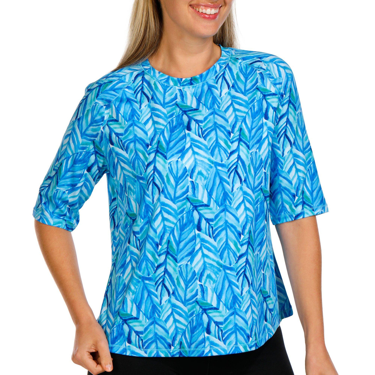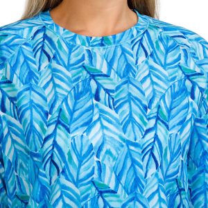 Discover the outdoors in this top! The palm leaf print design exudes coastal charm. Made from soft, lightweight stretch knit fabric, this top ensures maximum comfort and flexibility for all your outdoor adventures. A round neckline adds a touch of classic style, making it perfect for both active and casual wear. Embrace the outdoors in style with this versatile and elegant piece. Fabrication is 92% recycled polyester, 8% spandex.