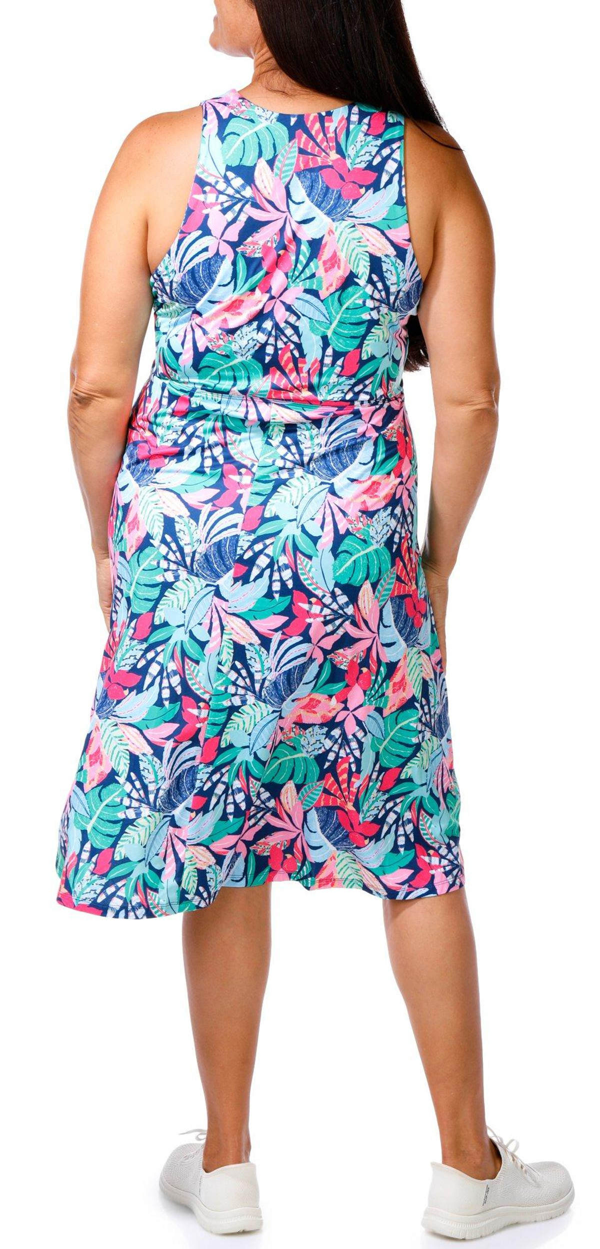 The Plus Active Floral Print Dress offers a perfect blend of comfort and style. Made from a soft and stretchy blend of 88% polyester and 12% spandex, this dress provides a flattering fit that moves with you and features performance stretch, UPF 50 protection, moisture wicking, cooling tech, quick dry and a built in bra.