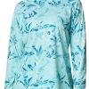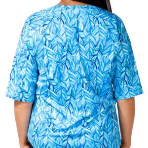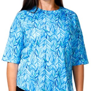 Discover the outdoors in this top! The bright abstract print design exudes coastal charm. Made from soft, lightweight stretch knit fabric, this top ensures maximum comfort and flexibility for all your outdoor adventures. A round neckline adds a touch of classic style, making it perfect for both active and casual wear. Fabrication is 92% recycled polyester, 8% spandex.