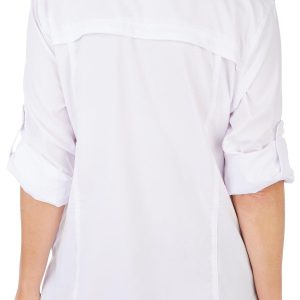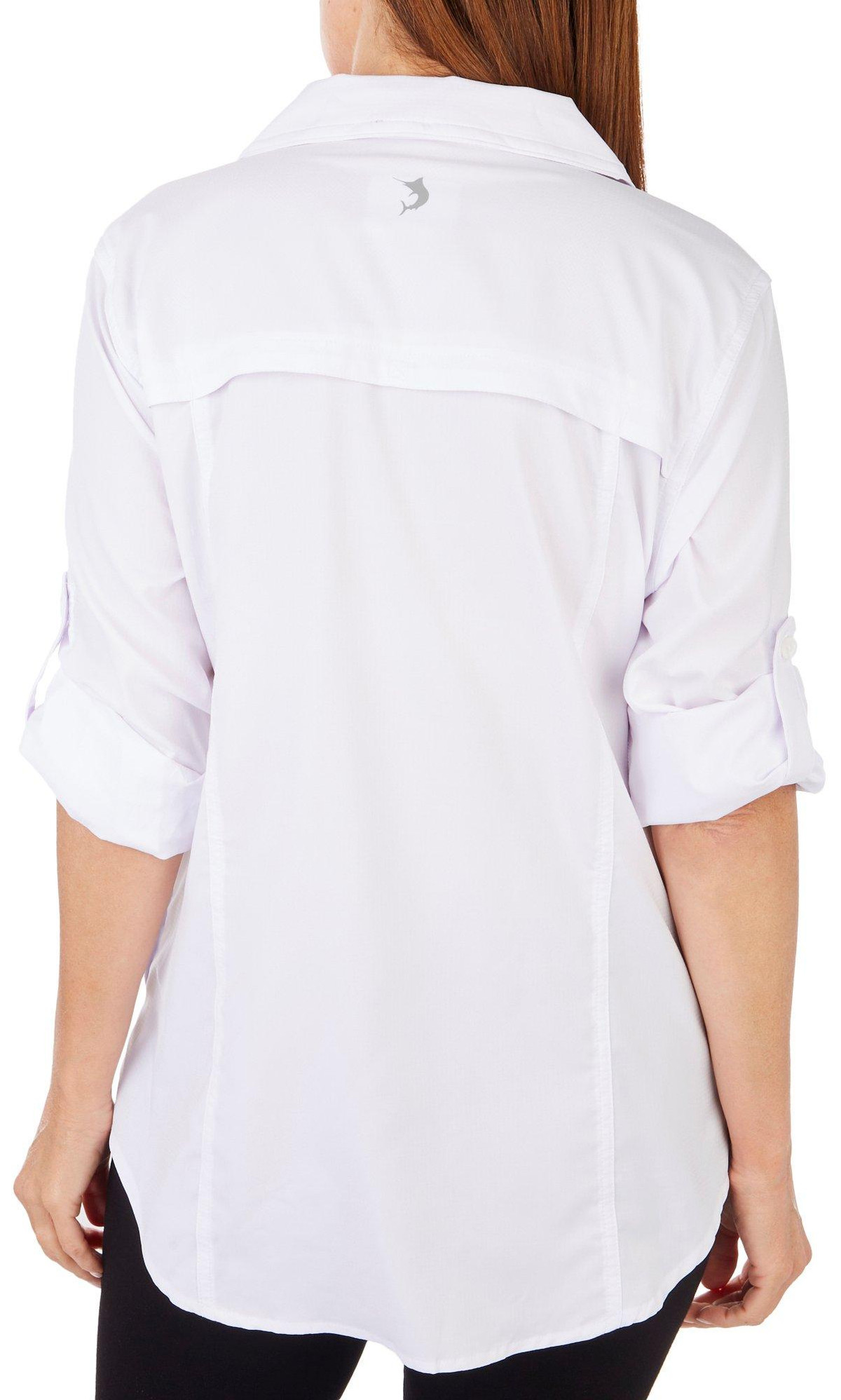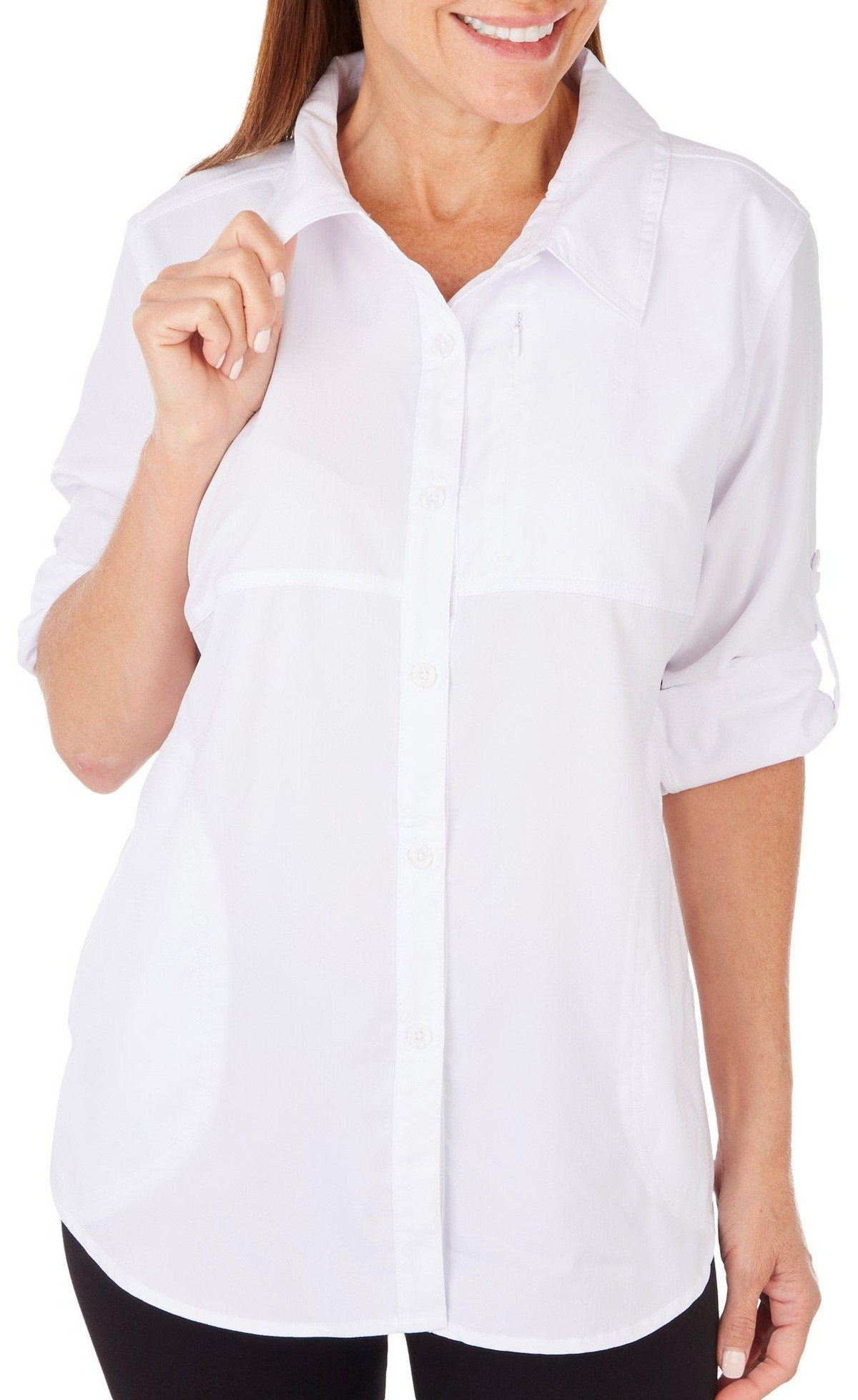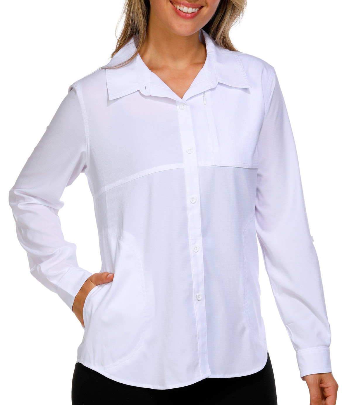 This long sleeve top features a solid color design on lightweight woven fabric, a point collar with button-down styling, zipper chest pocket, two front hand pockets, a vented back detail, roll tab sleeves, moisture wicking and quick dry technology, and UPF 50+ sun protection. The top length measures approximately 24 in. Fabrication 100% polyester.