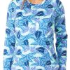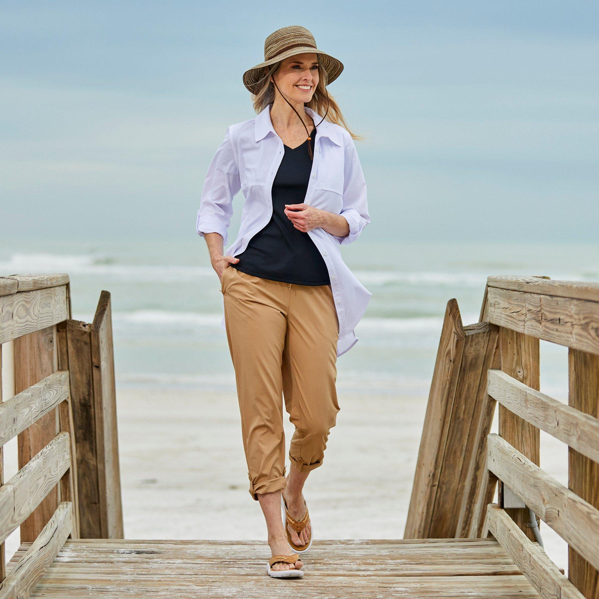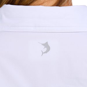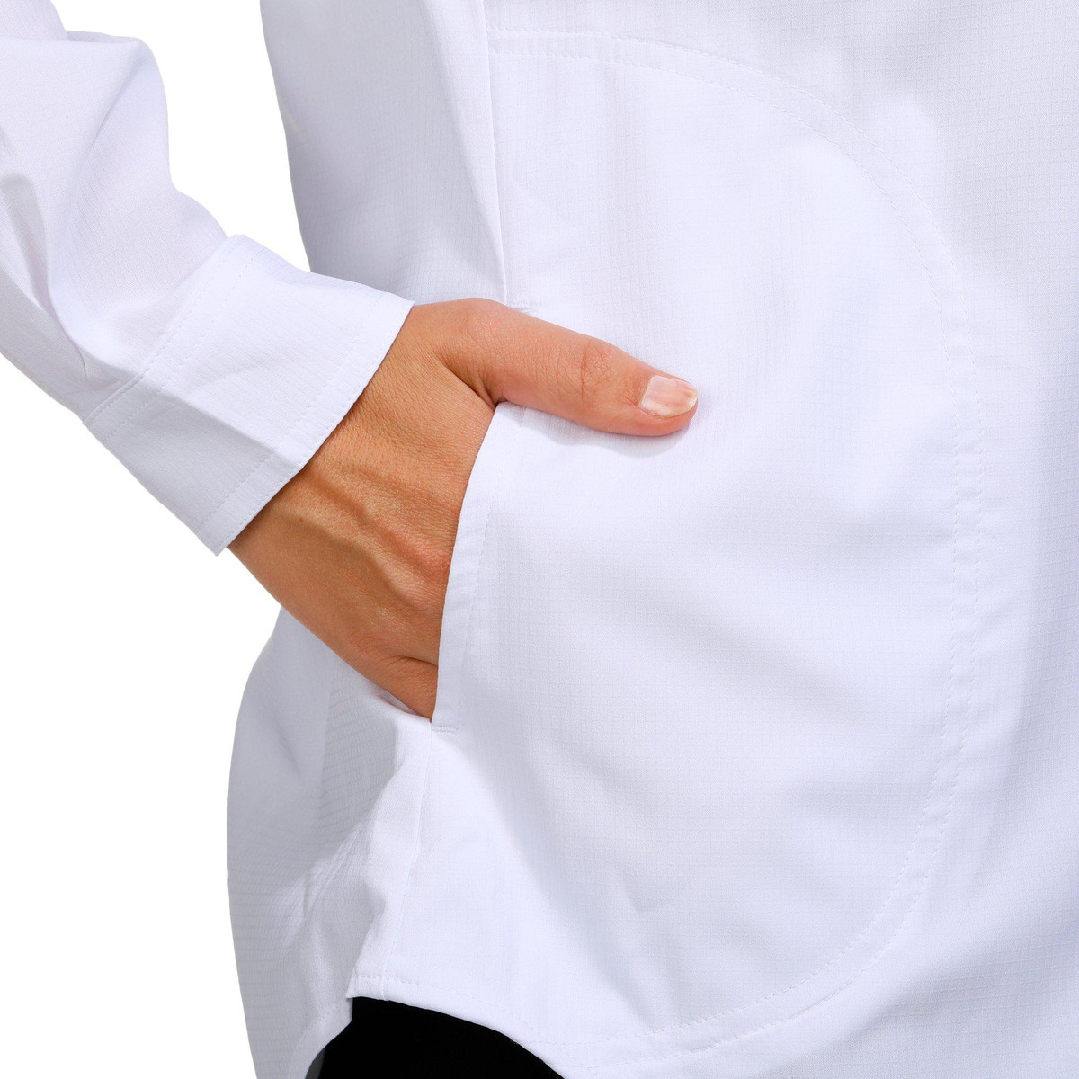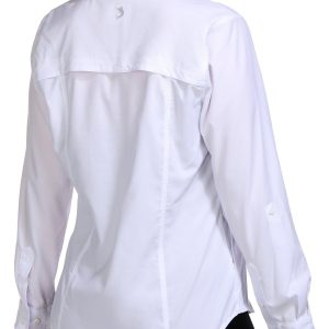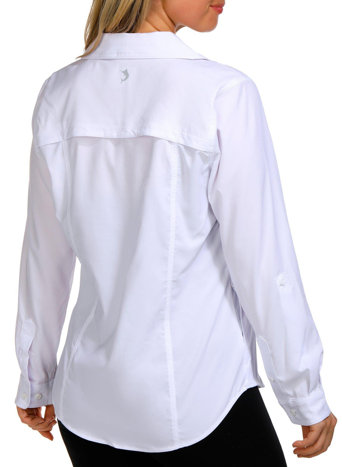 This long sleeve top features a solid color design on lightweight woven fabric, a point collar with button-down styling, zipper chest pocket, two front hand pockets, a vented back detail, roll tab sleeves, moisture wicking and quick dry technology, and UPF 50+ sun protection. The top length measures approximately 24 in. Fabrication 100% polyester.