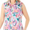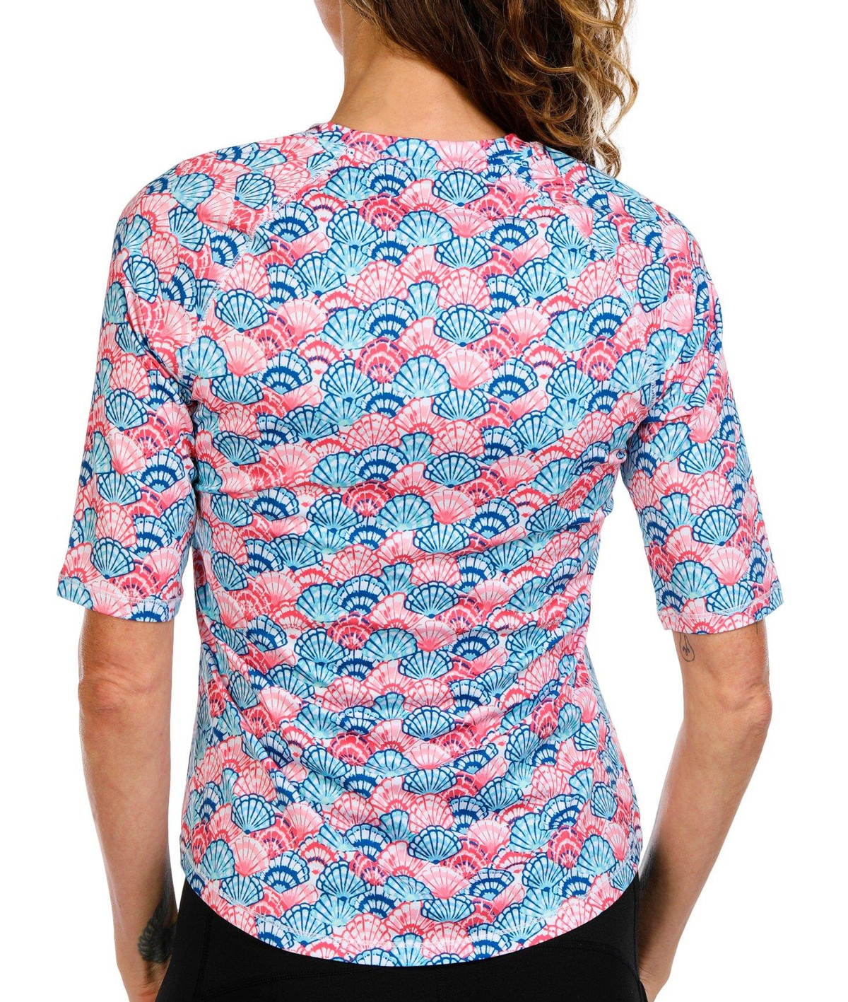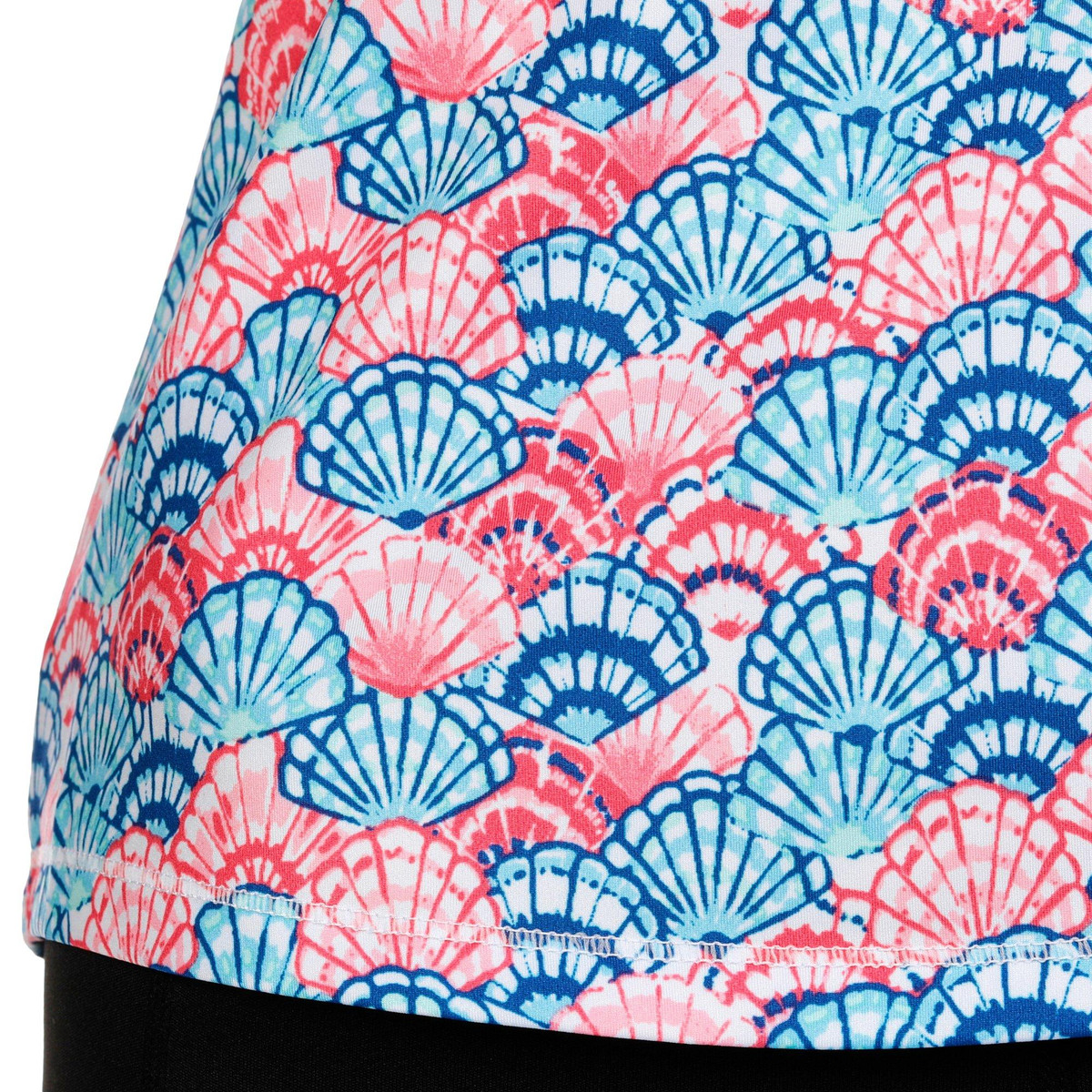 Discover the outdoors in this top! The scallop print design exudes coastal charm. Made from soft, lightweight stretch knit fabric, this top ensures maximum comfort and flexibility for all your outdoor adventures. A round neckline adds a touch of classic style, making it perfect for both active and casual wear. Embrace the outdoors in style with this versatile and elegant piece. Fabrication is 92% recycled polyester, 8% spandex.