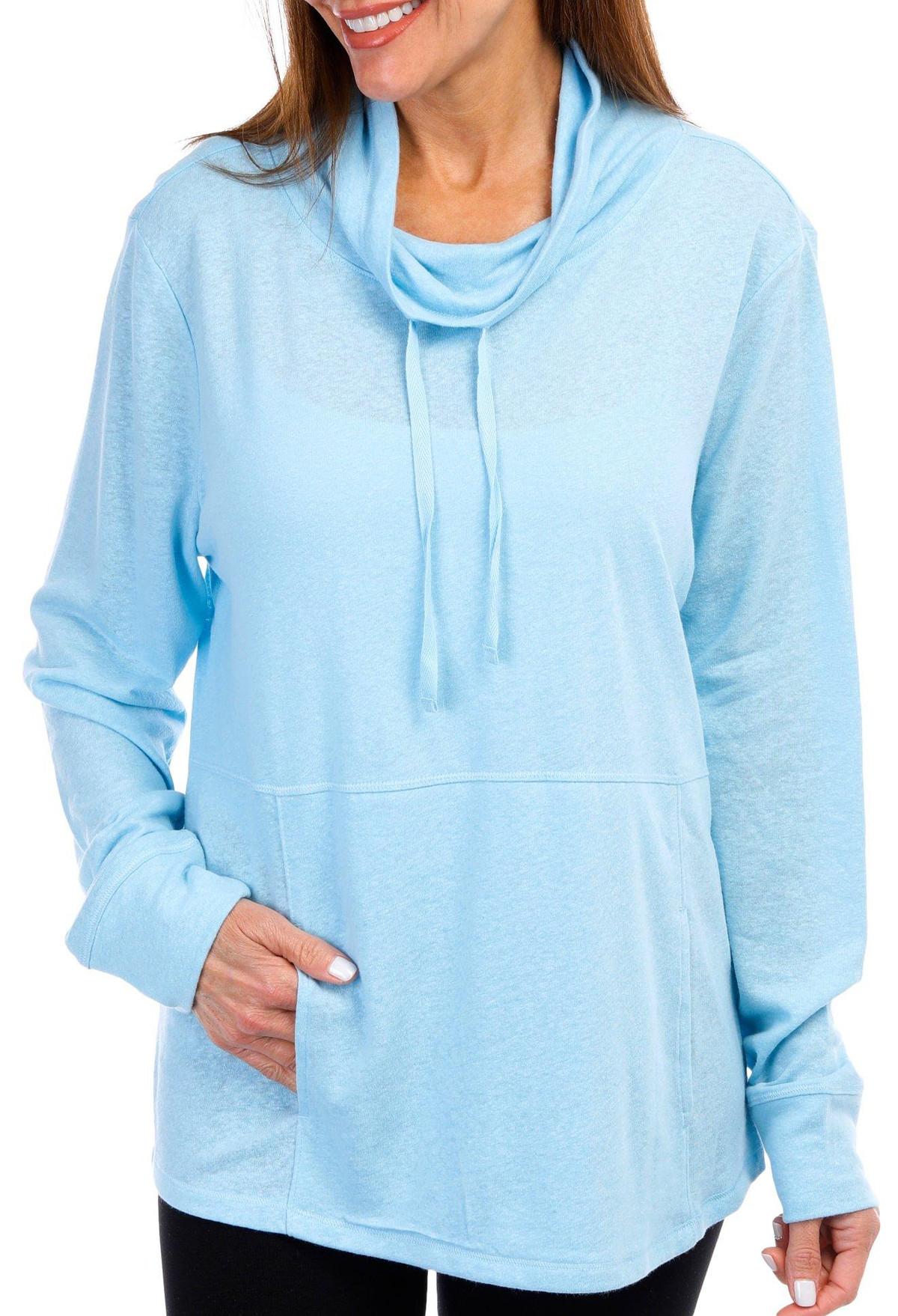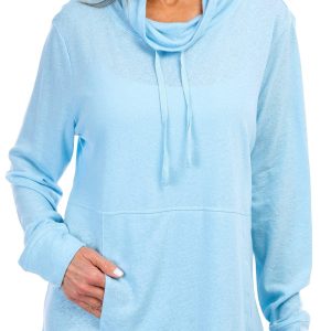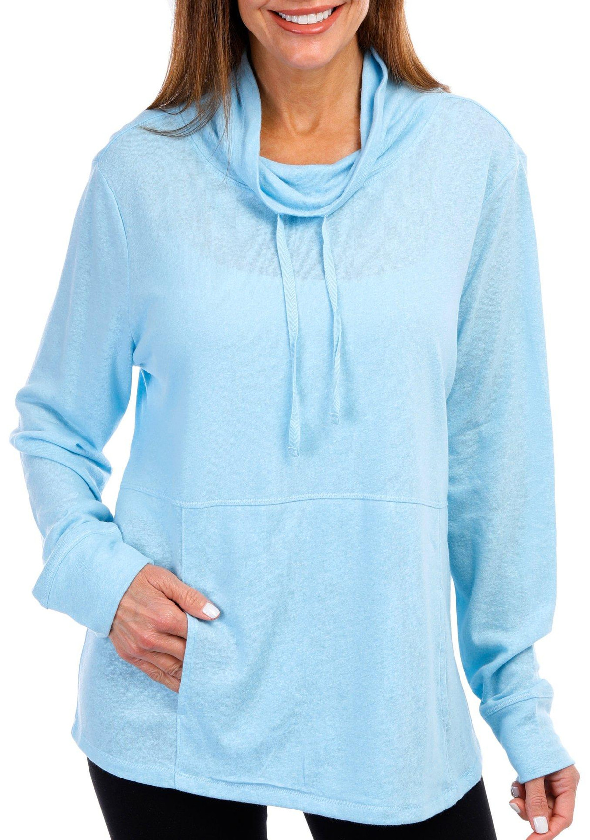 Embrace your adventurous spirit with this Cowl Neck Long Sleeve Sweatshirt. Featuring a stylish solid color design, this hoodie is perfect for those who love to explore. The soft, comfortable fabric and drawstring cowl-neckline ensure warmth and coziness, making it ideal for outdoor activities or casual wear. Top length measures approximately 22 in. Fabrication is 55% linen and 45% polyester.