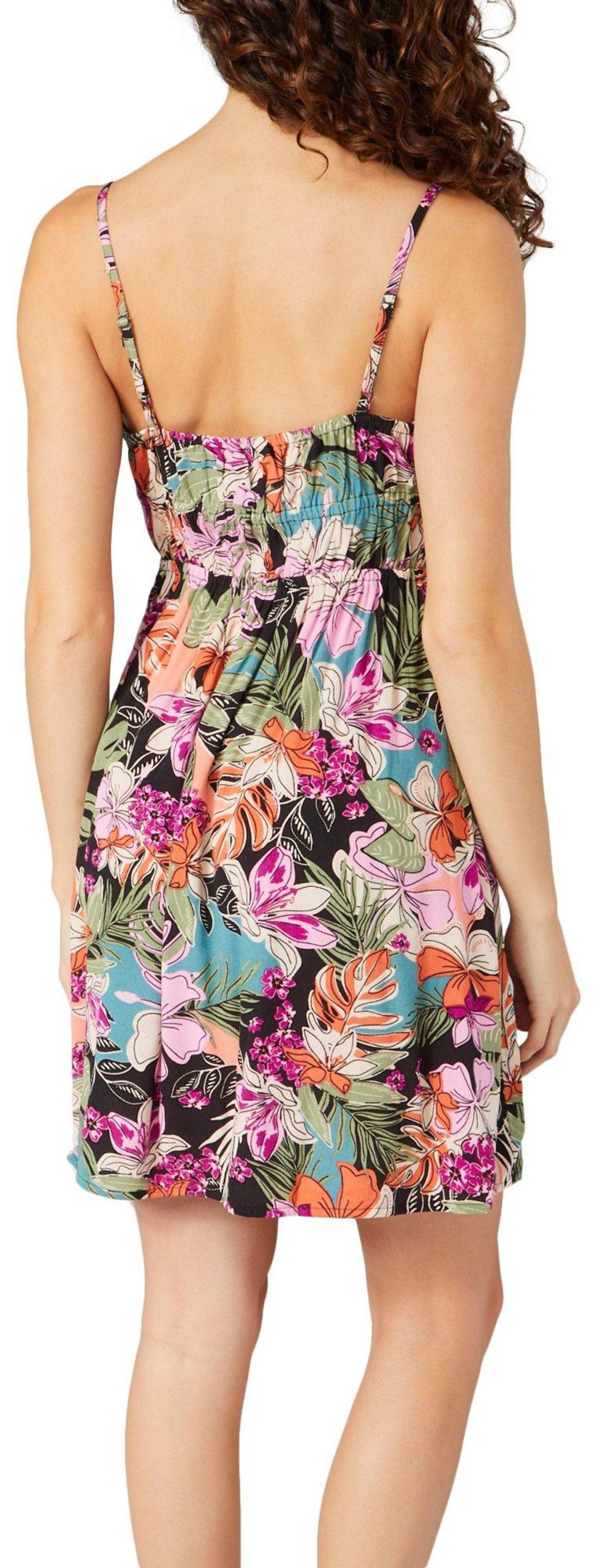 Introducing the Juniors La Vida Mini Dress, crafted from 100% viscose for a lightweight and flowy feel. This dress features a vibrant tropical floral print that brings a touch of paradise to your wardrobe. The adjustable straps ensure a perfect fit, while the keyhole neckline adds a stylish detail. With a length of 24 inches, this mini dress is perfect for warm weather outings, offering a chic and breezy look for any occasion.