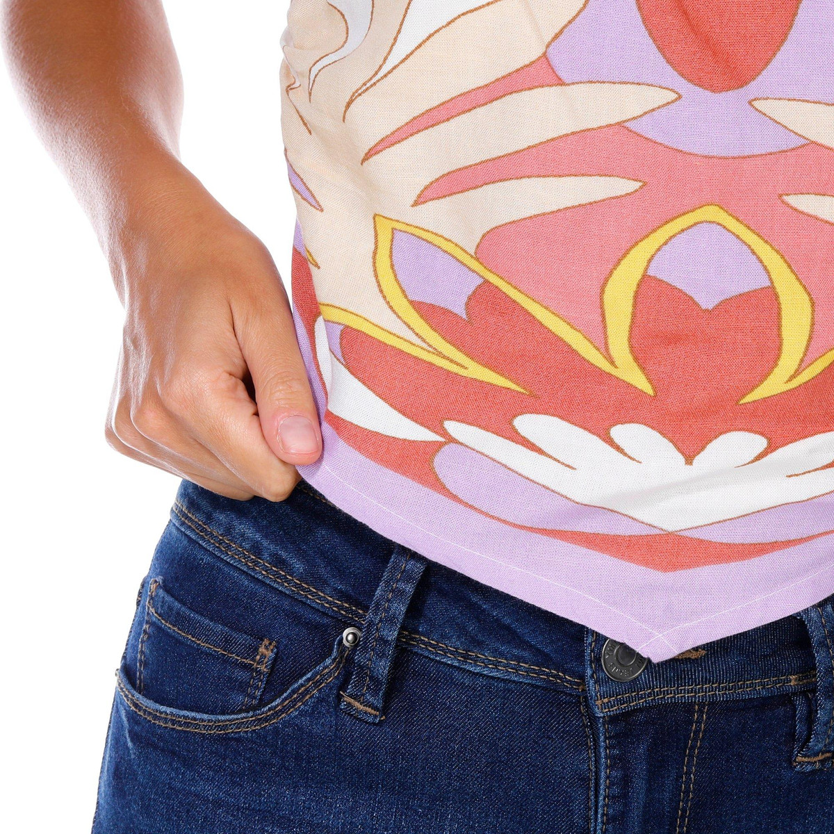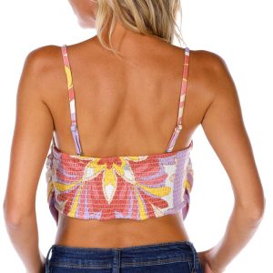 Stand out in this Roxy bandana-style printed top featuring bold patterns and a breezy fit. Perfect for festivals beach days or casual outings it pairs effortlessly with denim or flowy skirts. Soft fabric and eye catching print make it a go to for laid back style with a fun twist. Fabrication is 70% polyester and 30% elastaine.