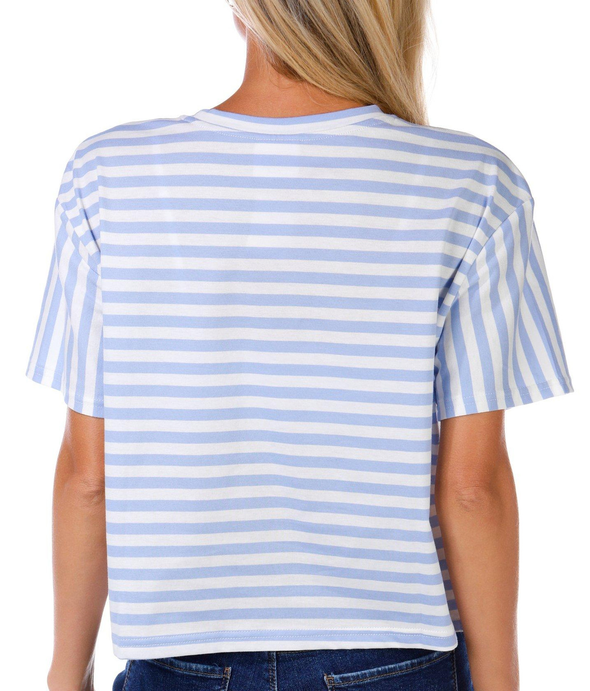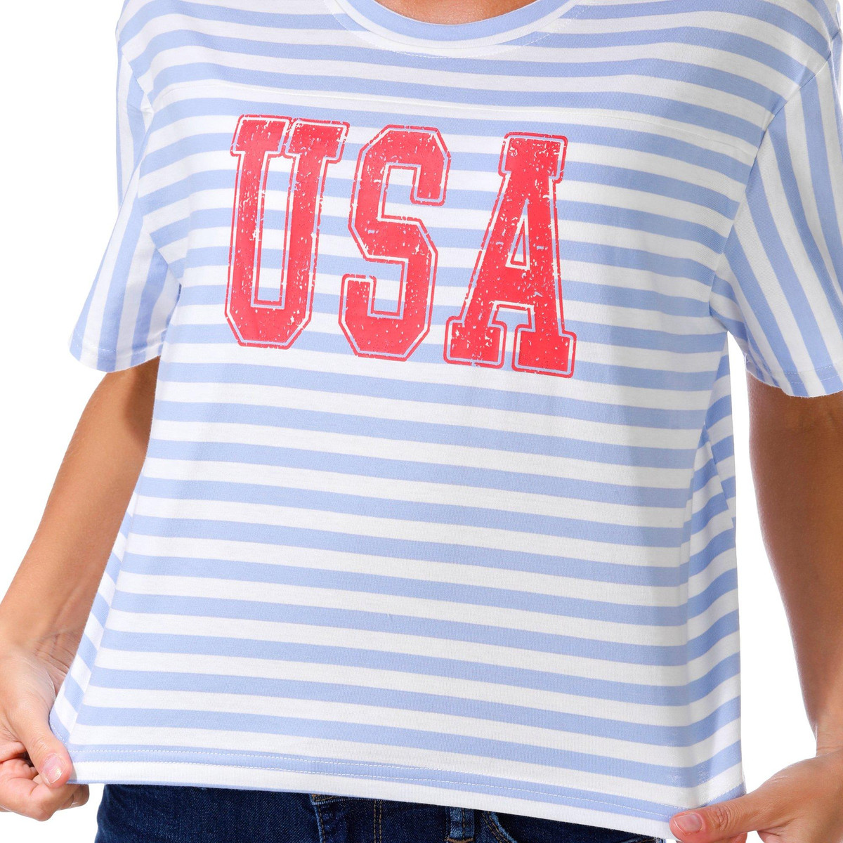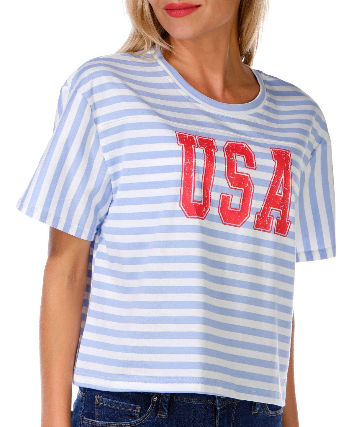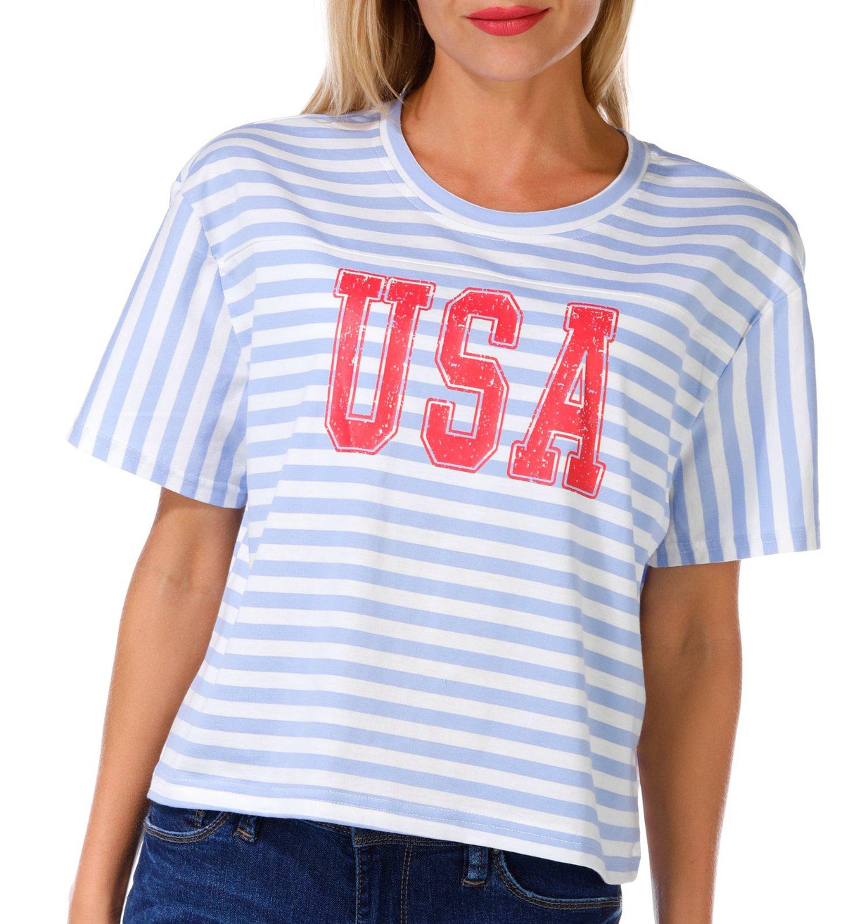 Juniors Cropped USA Graphic Tee shows off patriotic flair with a striped print, short sleeves, and a crew neckline. The cropped length adds a modern edge while the bold USA script brings classic Americana style to your everyday wardrobe. Fabrication 100% cotton
