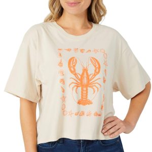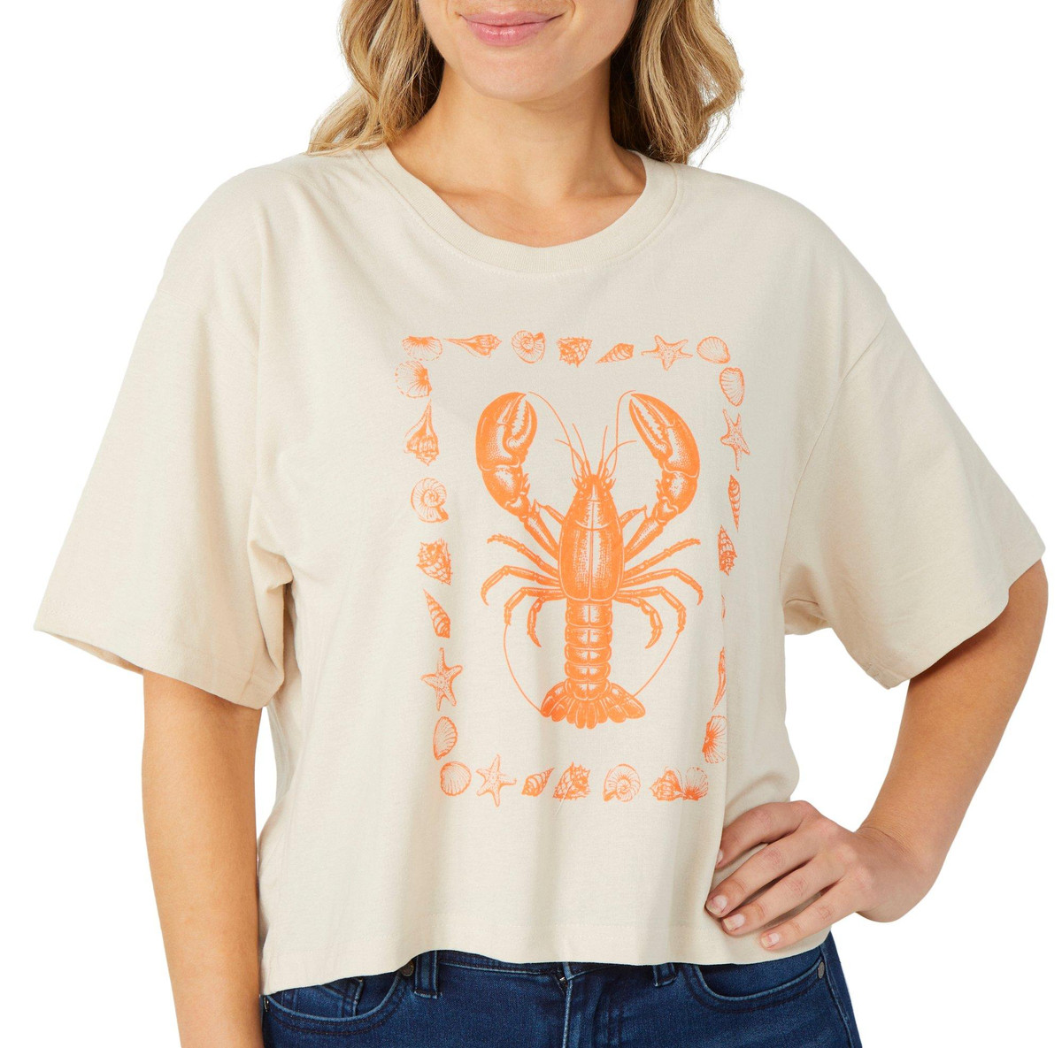 Embrace sunny vibes with this Juniors Lobster Graphic Crop T-Shirt. Made from a premium blend of cotton and polyester, this tee features a lobster and seashells graphic design, short sleeves, a classic crew neckline and a stylish cropped length. Perfect for casual outings or beach days, this t-shirt combines comfort and style effortlessly, making it a versatile addition to your summer wardrobe. Fabrication is 60% cotton, 40% polyester. Top length measures approximately 22 in.