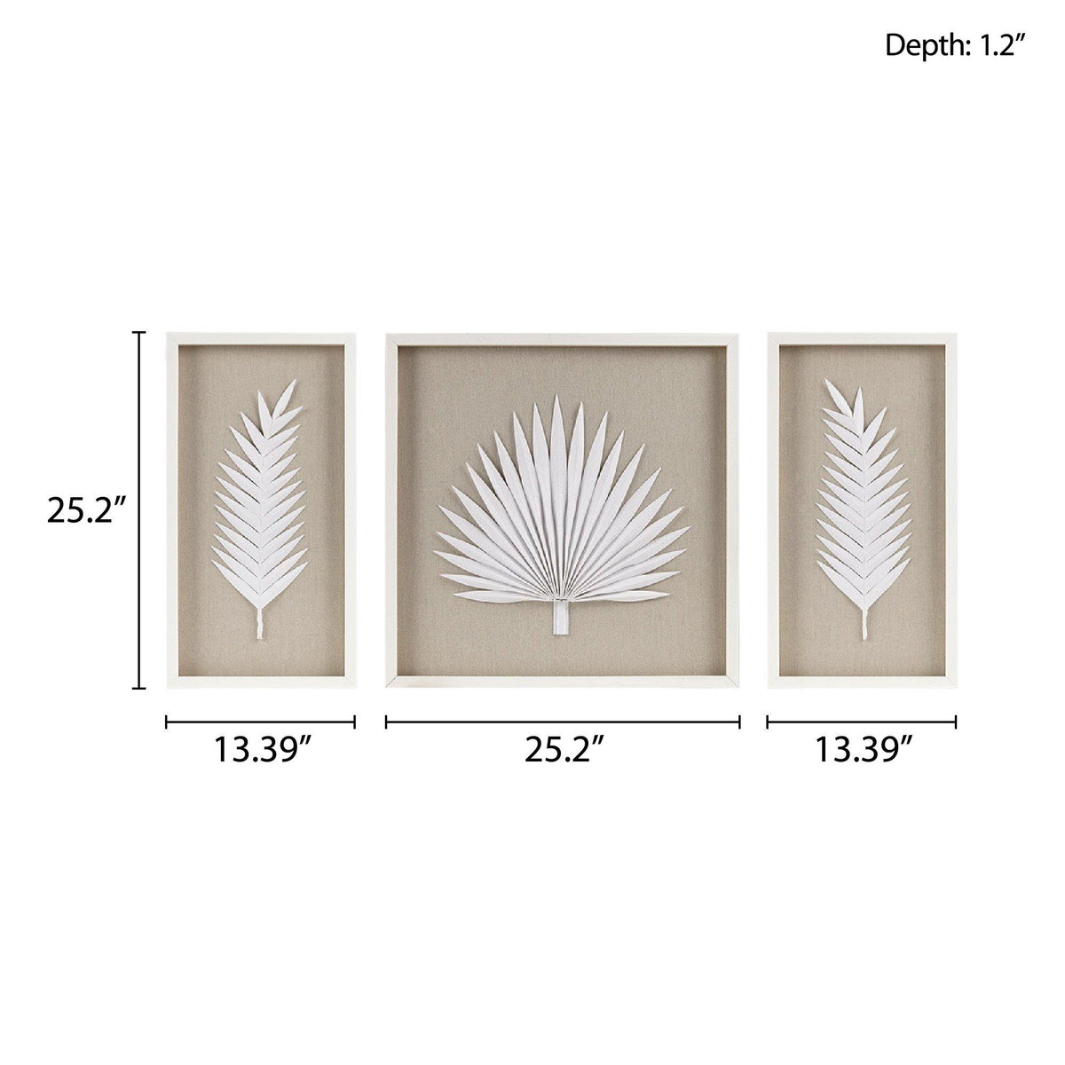 Refresh your space with the coastal elegance of the Madison Park Sabal Framed Rice Paper Palm Leaves 3-piece Shadowbox Wall Decor Set. Each shadow box features a handmade, rice paper palm placed under glass on a soft linen ground for a natural touch while the white frame finish provides an elevated, gallery look and feel.