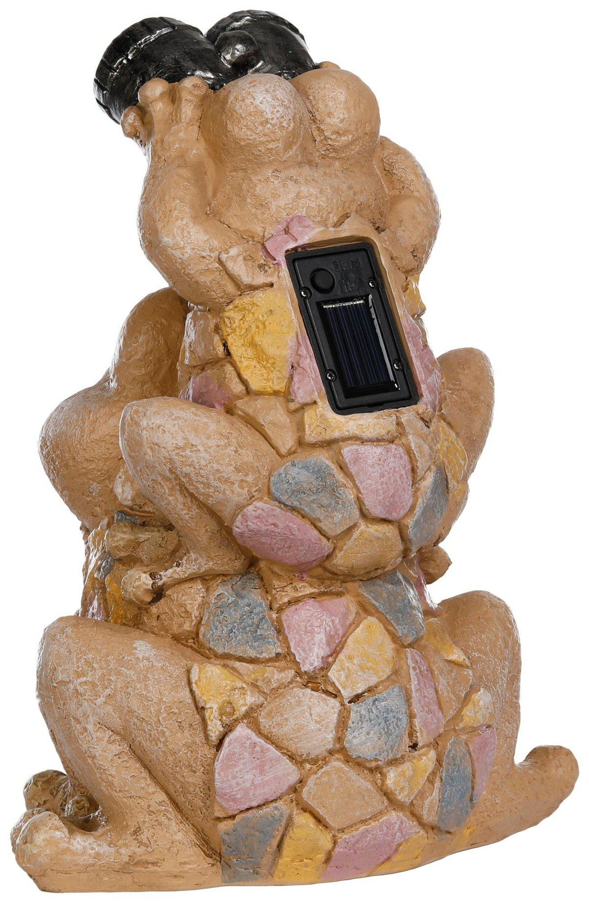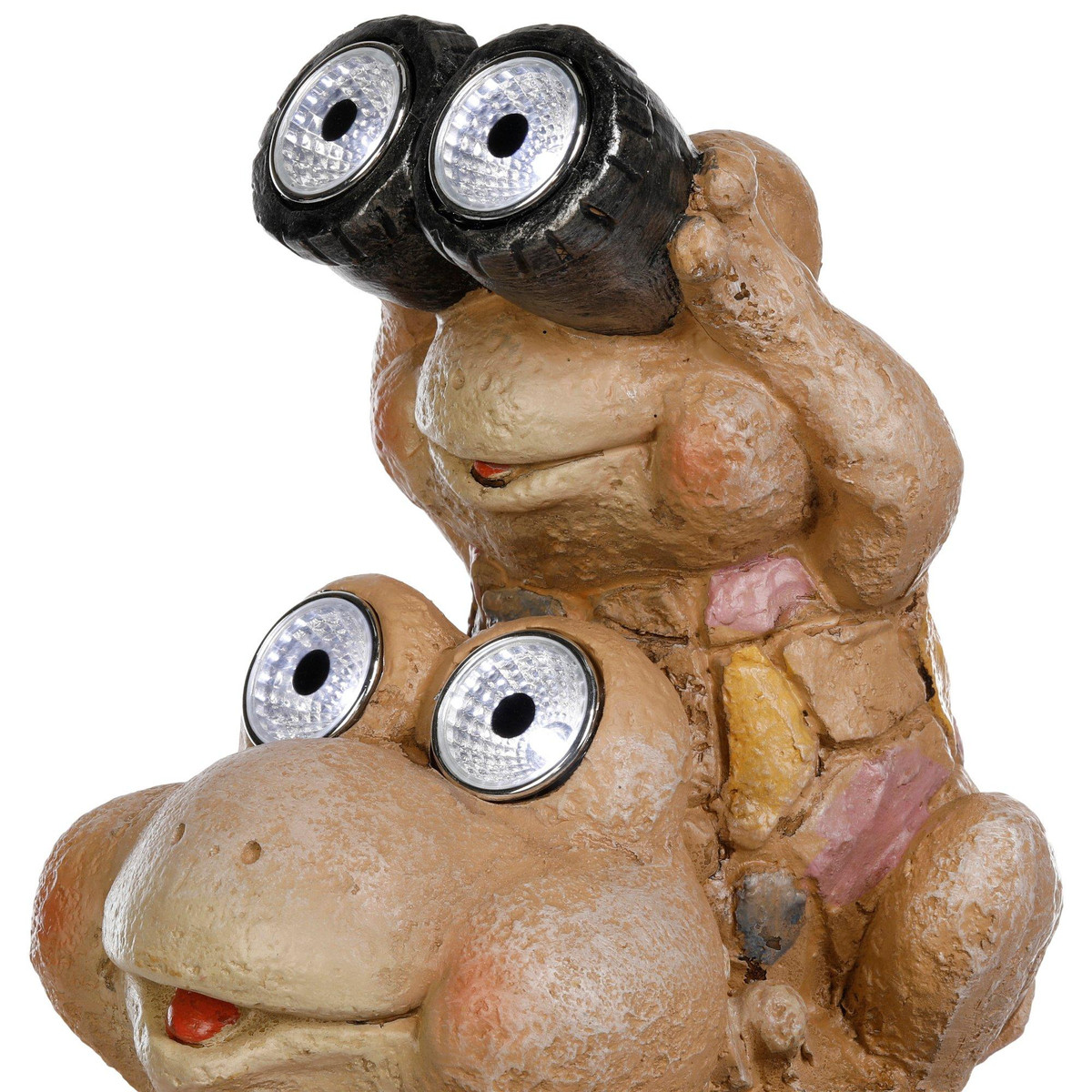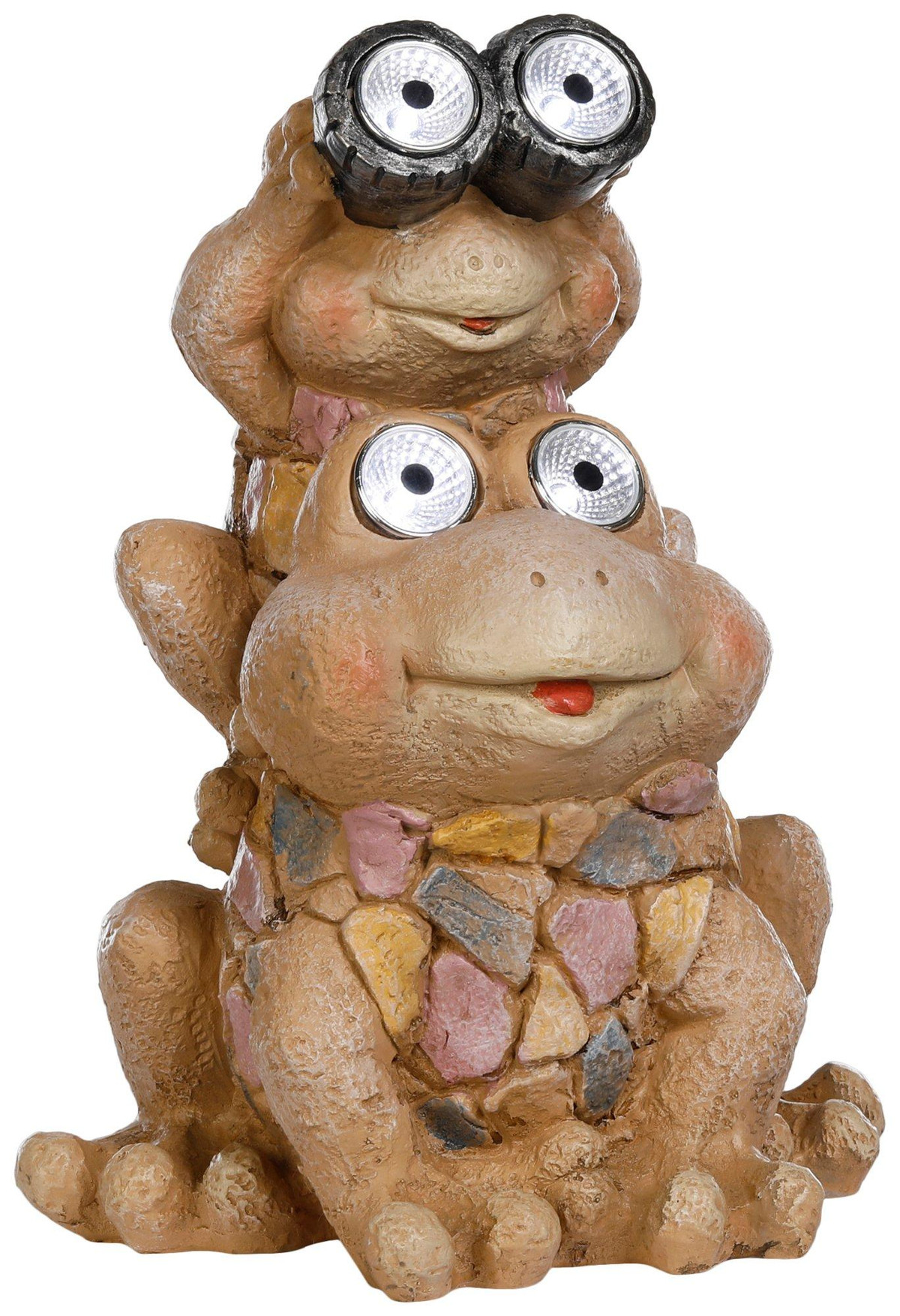Brighten up your garden with the 14 Solar Piggy Back Frogs Figurine featuring multi-color accents on the frogs chests. This whimsical piece showcases two playful frogs stacked together, adding charm and personality to any outdoor space. Crafted from durable resin and equipped with a solar panel, it captures sunlight by day and glows at night. Standing 14 inches tall, its a magical addition for patios, flower beds, or as a cheerful gift for garden lovers.