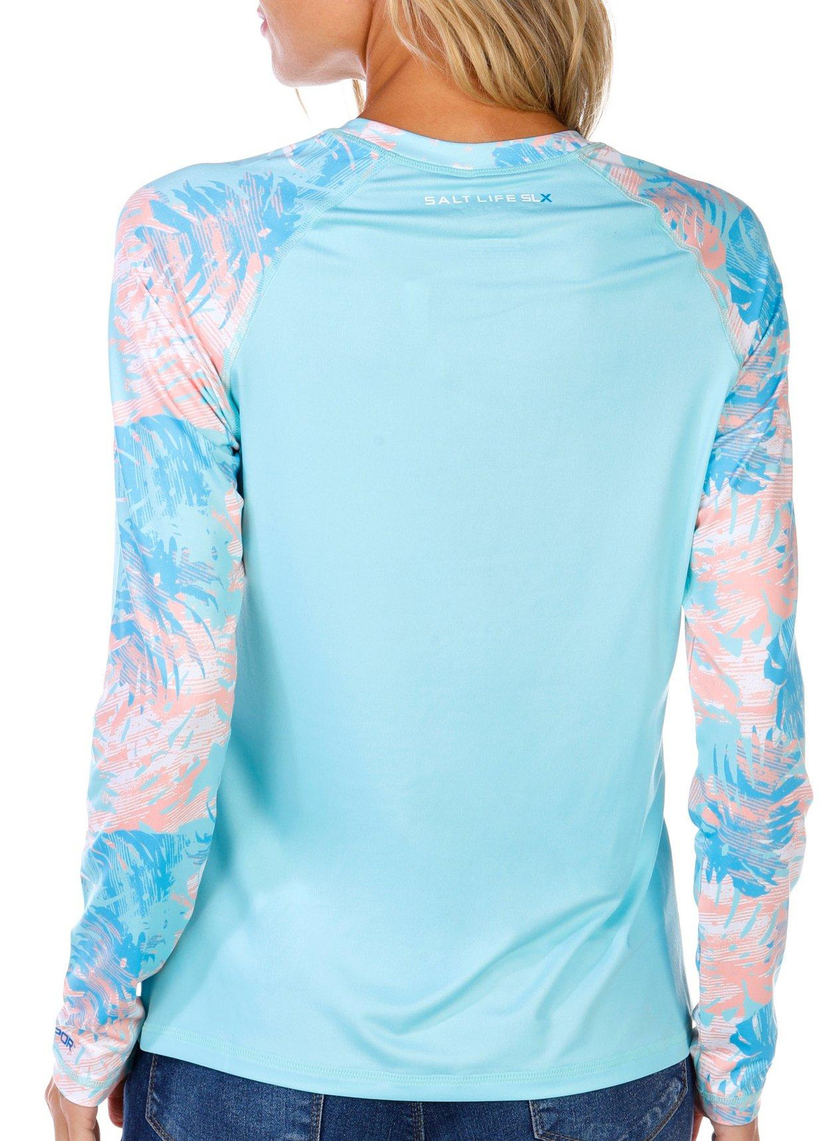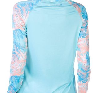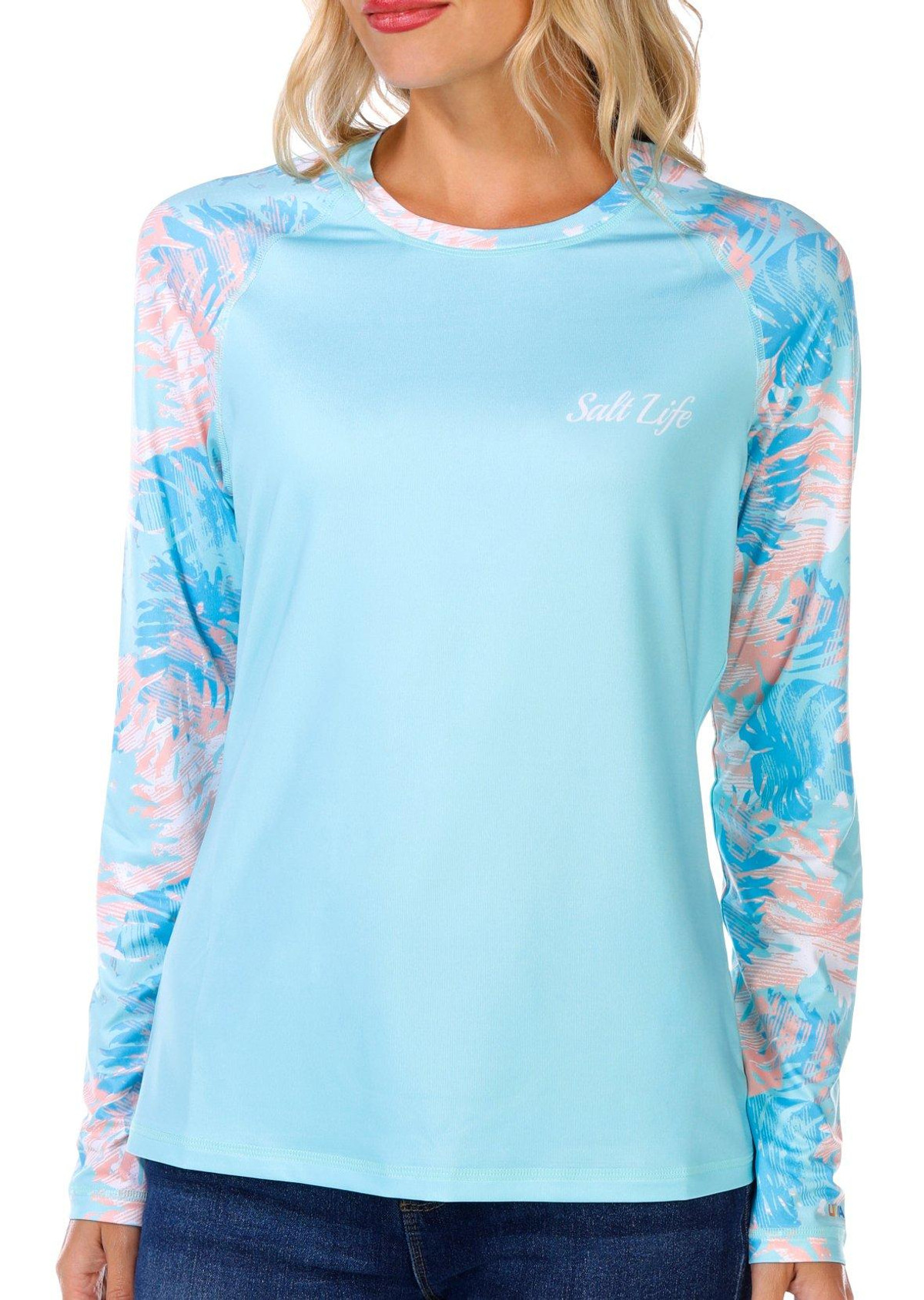 Juniors Long Sleeve On Holiday Performance Top blends tropical style with active comfort. Featuring a vibrant print, crew neckline, and long sleeves, it offers UPF 30 protection, moisture wicking, antimicrobial properties, and performance stretch for all day wear. Fabrication 88% polyester, 12% spandex