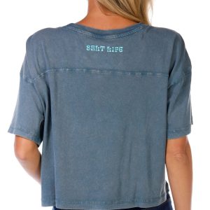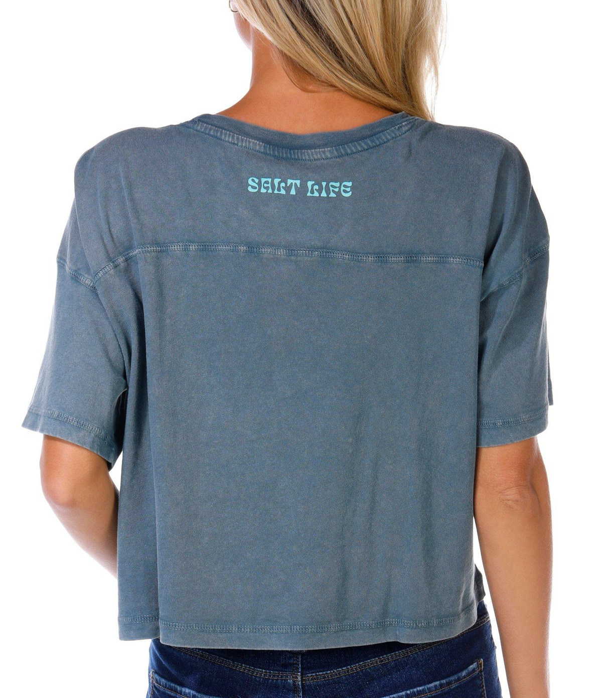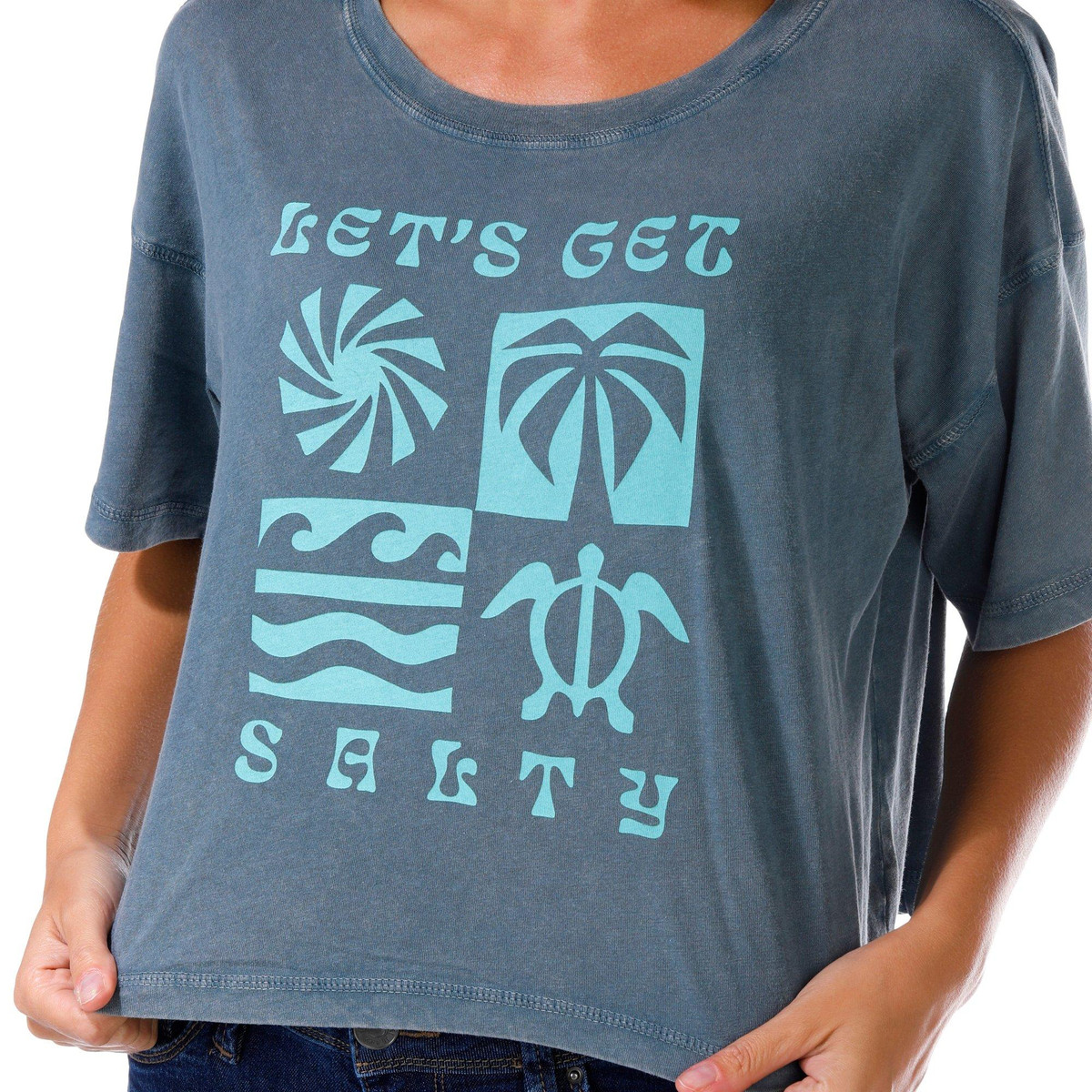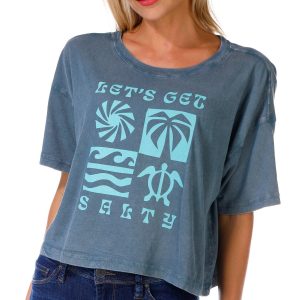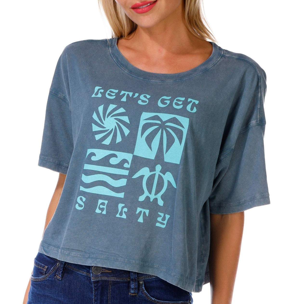 Juniors Stay Salty Graphic Crop Top brings laid back beach vibes with a soft washed finish and lightweight fabric. Featuring a crew neckline, short sleeves, and a cropped fit, it is styled with a beach themed graphic and Stay Salty script for a relaxed coastal look. Fabrication 100% cotton