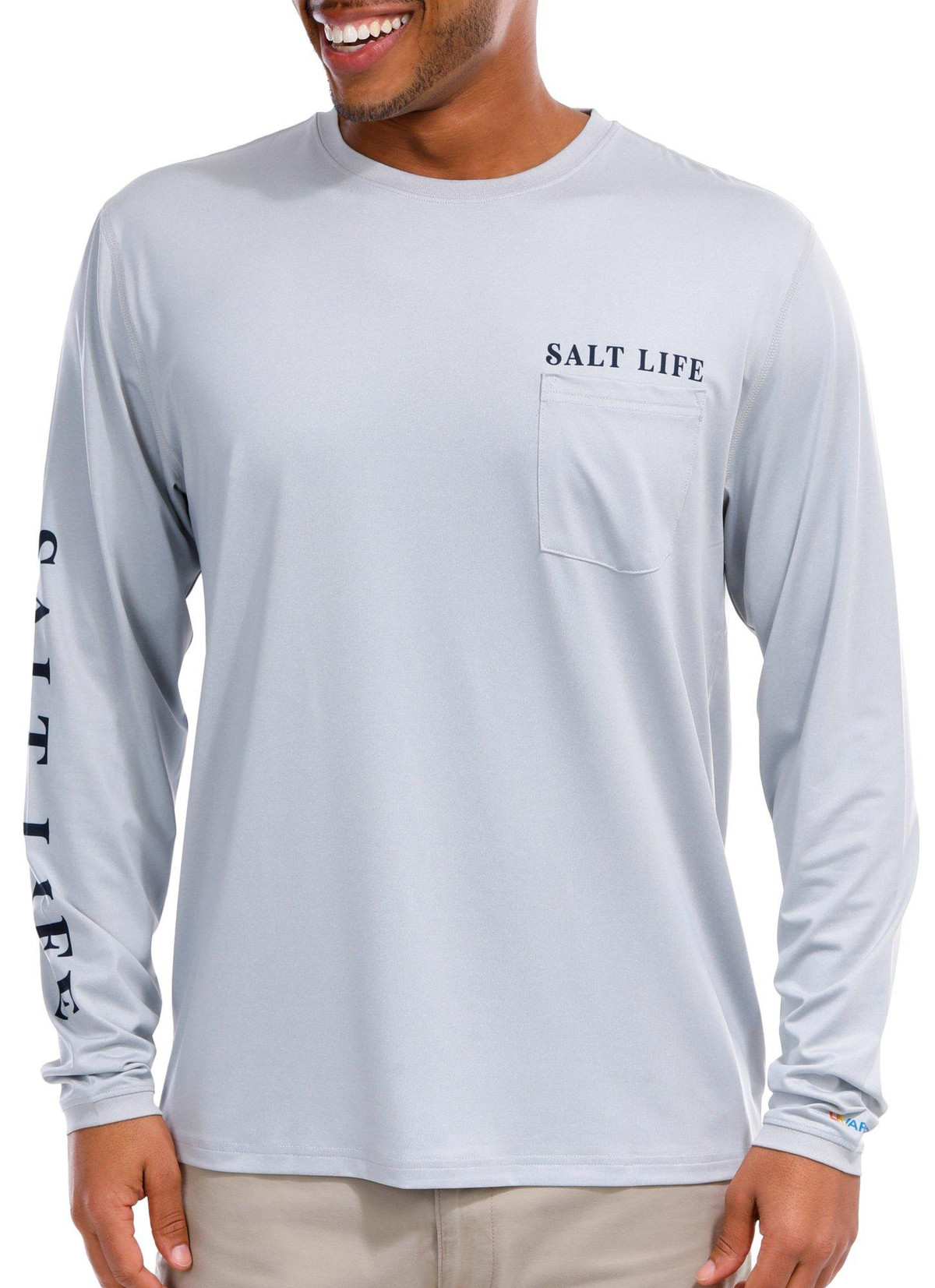 Perfect for your next fishing trip or outdoor adventure, this long-sleeve performance tee features a solid color design on ultra-soft quick reaction fabric, a screen print on the back and logo on the front chest and sleeve, chest pocket, a crew neckline, moisture-wicking and anti-microbial technology, and UPF 30 sun protection.