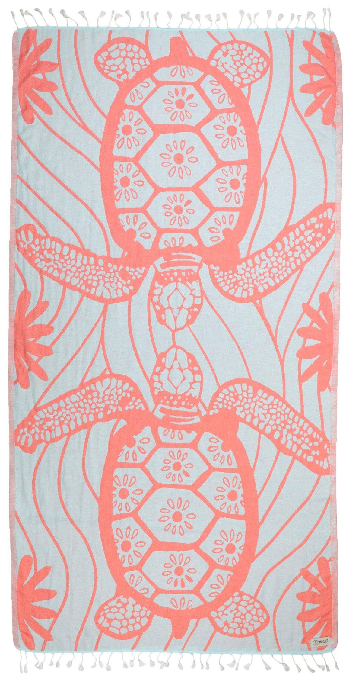 Enjoy your beach days with the Cotton Beach Towel, featuring a charming sea turtle print design and stylish fringe edges. This towel is not only soft and absorbent but also supports a great cause, as a portion of the profits goes to marine conservation efforts. Measures 37 in x 67 in.