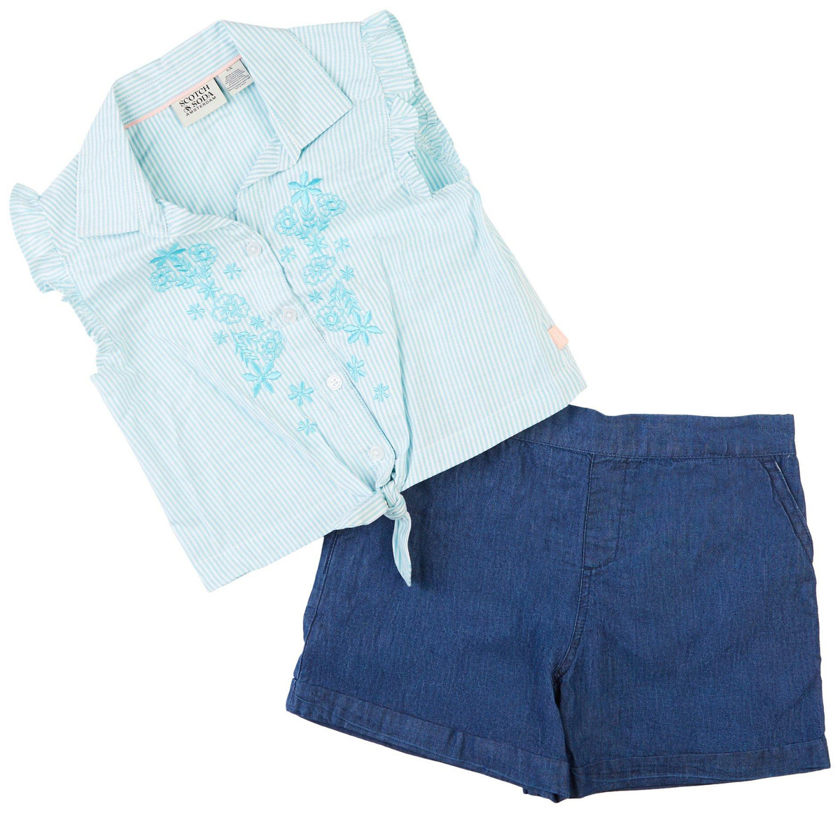 The Little Girls 2 Piece Shorts Set features a sleeveless button down striped shirt with sweet ruffle trim paired with dark denim wash chambray shorts. This charming outfit blends classic style with playful details for a fresh warm weather look. Fabrication 100% cotton