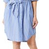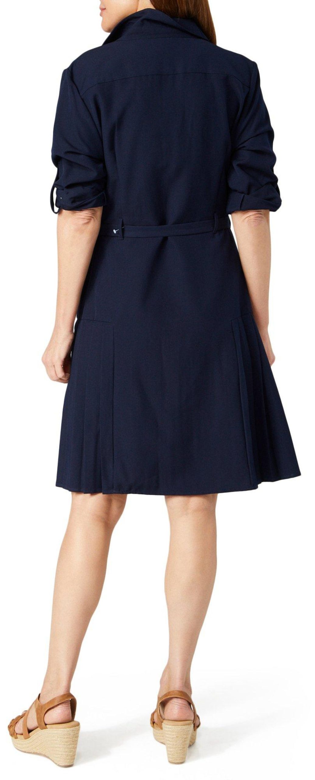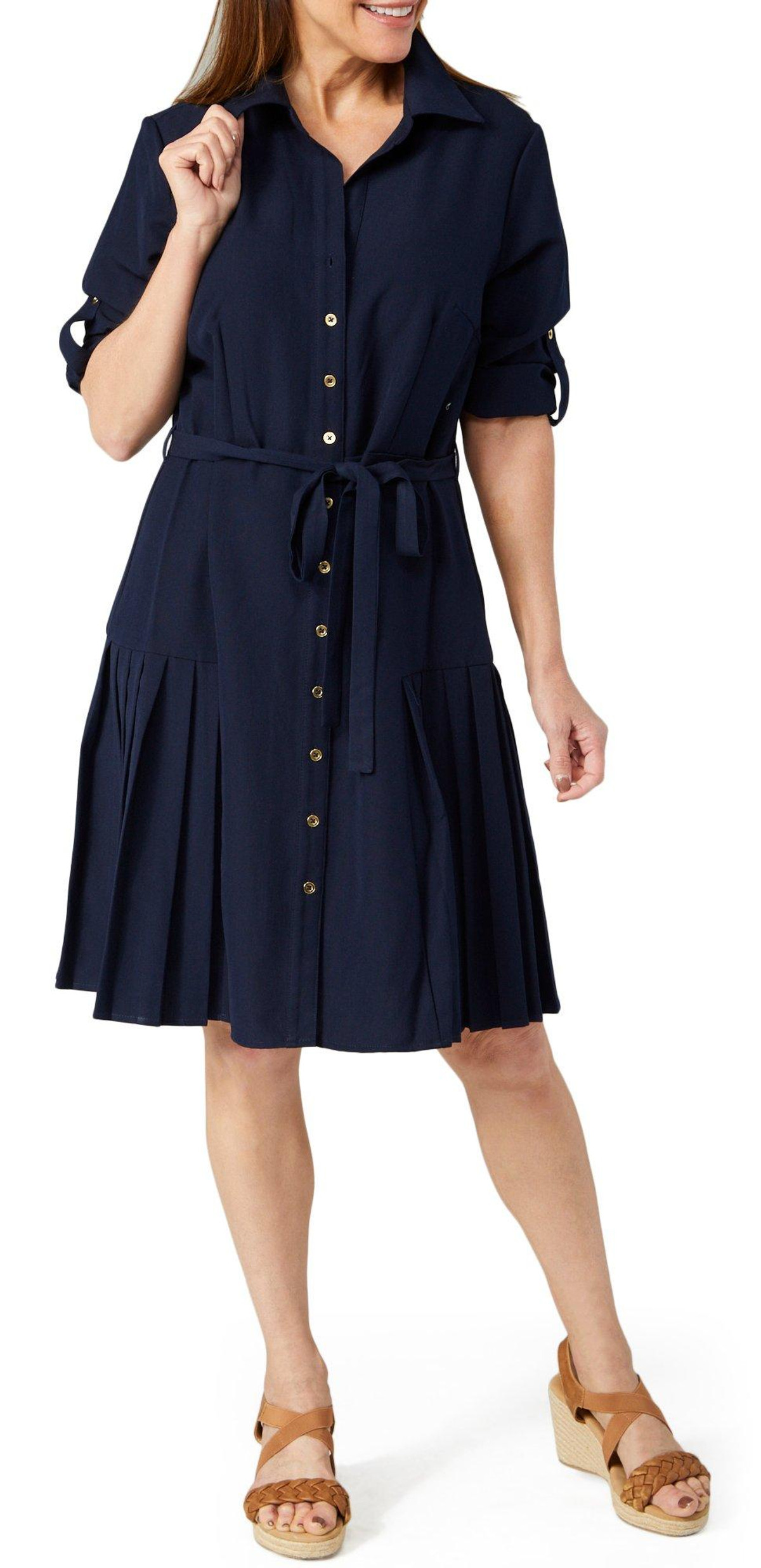 Elevate your style with this 3/4 Rolled Sleeve Shirt Dress, featuring a classic buttoned front and a flattering waist tie. The pleated hem details add a touch of elegance, while the stretch sharkskin fabric ensures a comfortable and flexible fit. Perfect for both professional settings and casual outings, this dress offers a sophisticated silhouette that enhances your natural shape. Fabrication is 75% polyester, 20% rayon, 5% spandex.