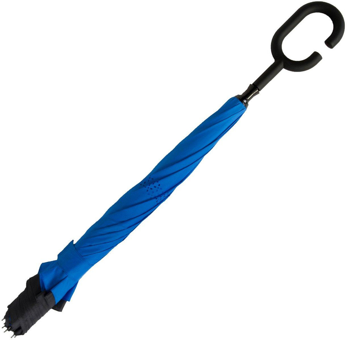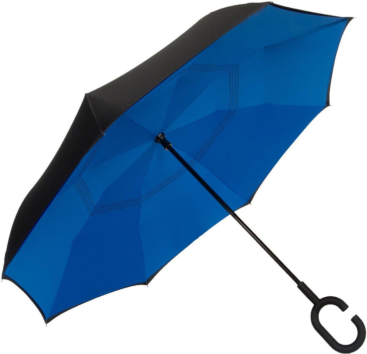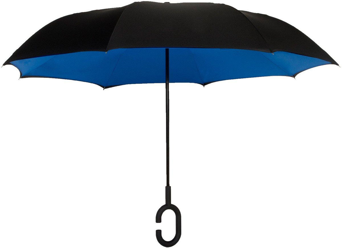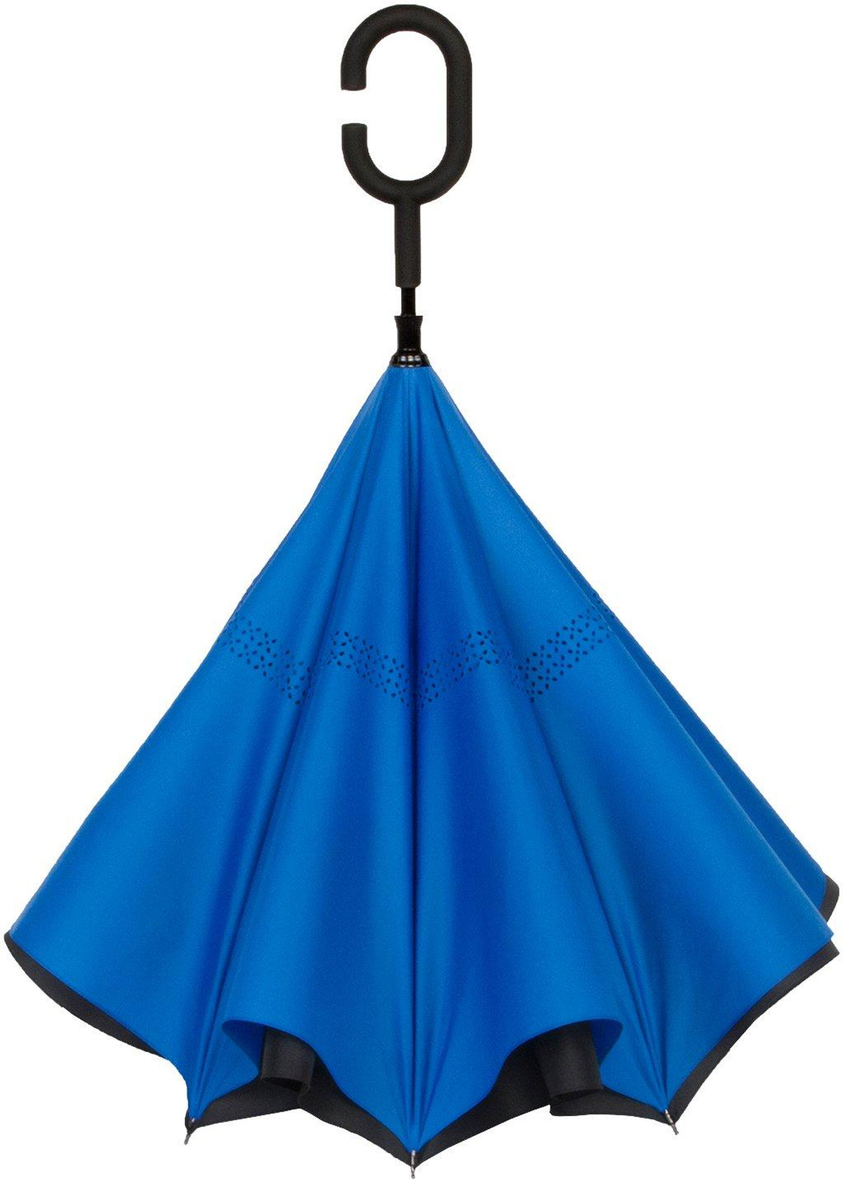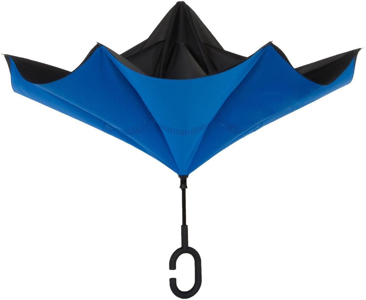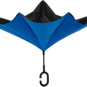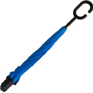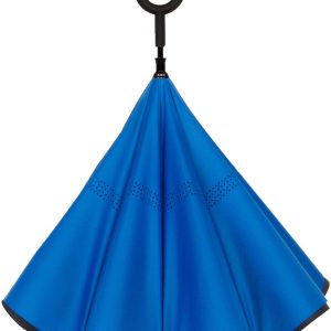 This UmbelievaBrella Umbrella has a solid color design on polyester fabric with a laser cut detail. Features a unique reverse open and close system, allowing the water to stay away from you by funneling into the umbrella when it’s closed. Features are a non-slip rubber-coated C-shaped handle for hands-free use, 48 inch arc, manual function, stands by itself, steel and fiberglass construction, and dual print coordinating patterns. It’s UnbelievaBrella! Measures approximately 32 inch closed.