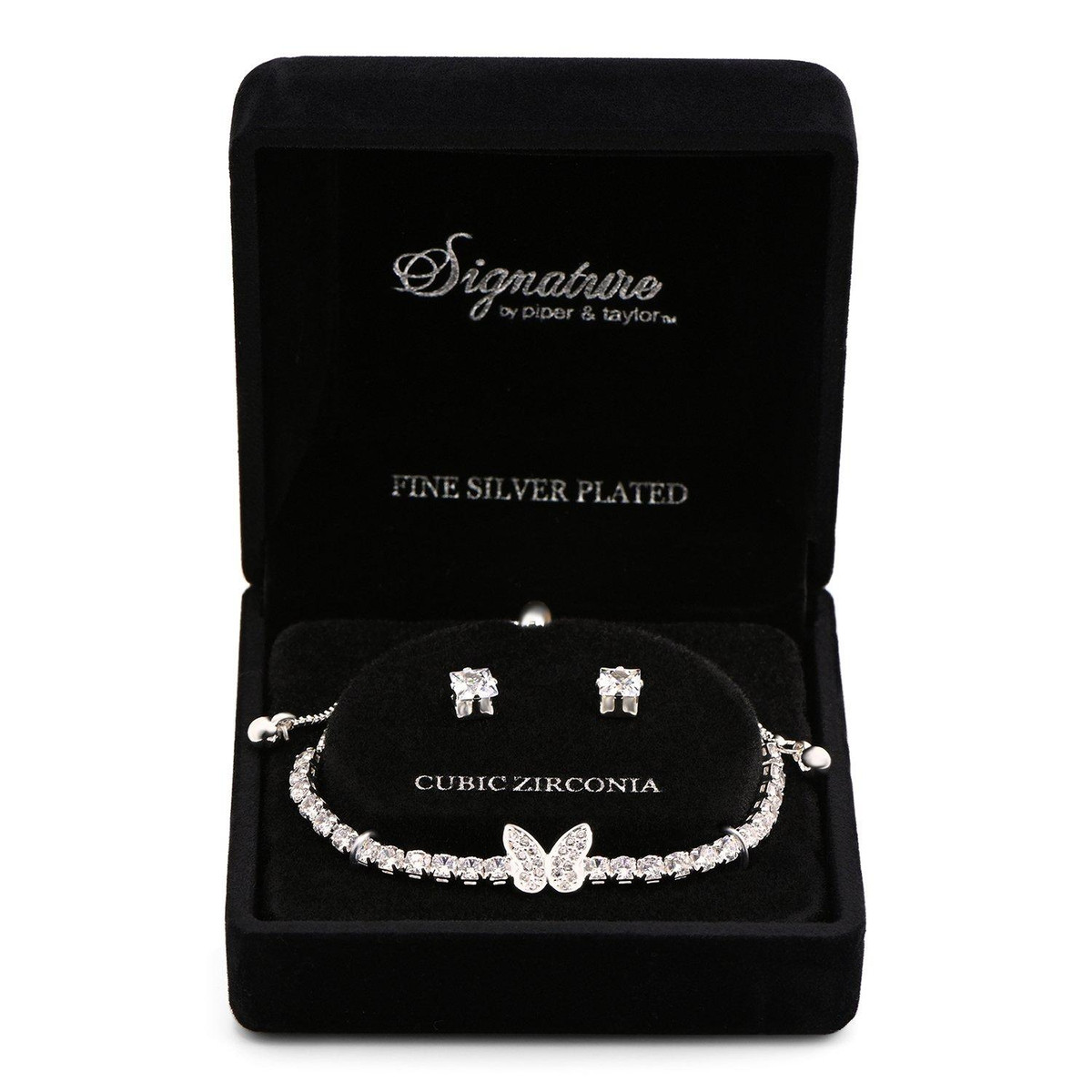 The Signature Butterfly Bracelet & Earring Set features delicate, butterfly-inspired designs, adding a whimsical yet elegant touch to your jewelry collection. The set includes a beautifully crafted bracelet and matching earrings, both adorned with intricate detailing and shimmering stones. Perfect for adding a playful yet sophisticated element to any outfit, this set is ideal for both casual and special occasions.