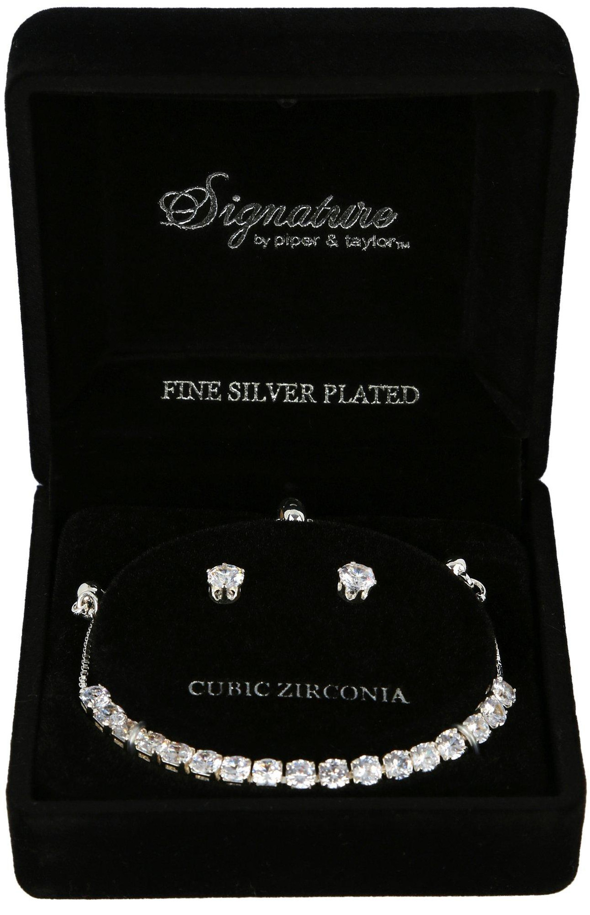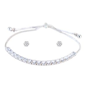 The Signature CZ Bolo Bracelet & Stud Earrings Set features a sparkling cubic zirconia tennis bracelet with an adjustable bolo closure for a perfect fit, paired with classic CZ stud earrings that add timeless elegance. This versatile set is ideal for both everyday wear and special occasions, offering a refined, sophisticated look that enhances any outfit. A perfect gift or a chic addition to your jewelry collection.