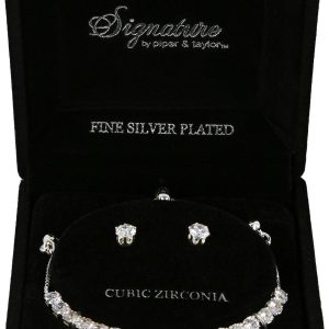 The Signature CZ Bolo Bracelet & Stud Earrings Set features a sparkling cubic zirconia tennis bracelet with an adjustable bolo closure for a perfect fit, paired with classic CZ stud earrings that add timeless elegance. This versatile set is ideal for both everyday wear and special occasions, offering a refined, sophisticated look that enhances any outfit. A perfect gift or a chic addition to your jewelry collection.