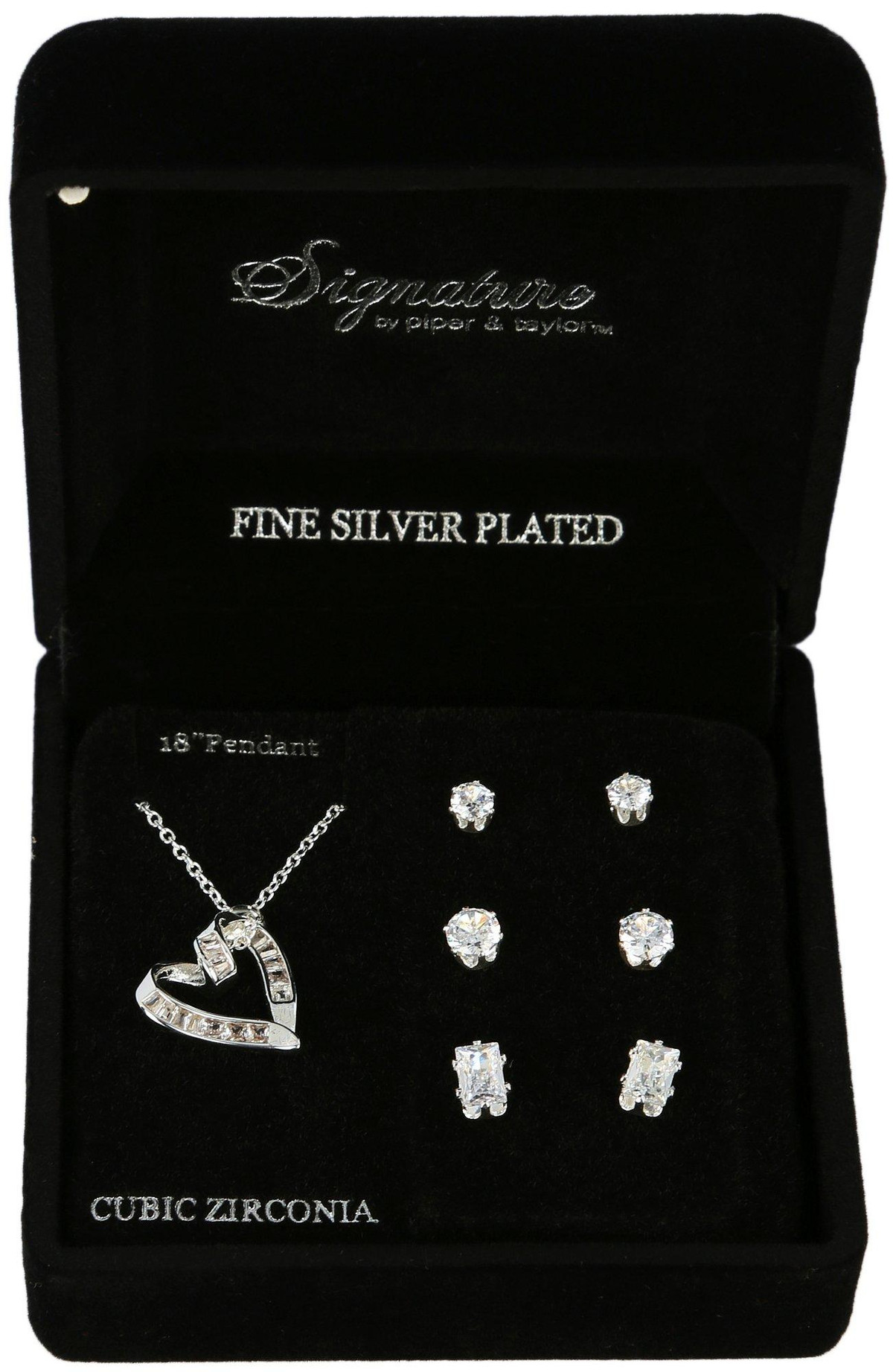 The Signature CZ Heart Necklace & 3-Pc. Earrings Set is a beautiful combination of elegance and romance. The set features a sparkling heart-shaped CZ pendant necklace that adds a touch of charm to any outfit. Accompanying the necklace are three pairs of earrings: classic CZ stud earrings, chic hoop earrings, and elegant drop earrings, all designed to complement the heart pendant perfectly.