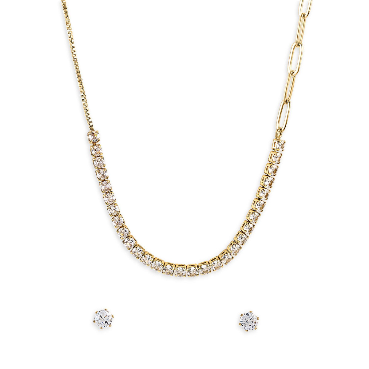 The Signature CZ Necklace & Earrings Set features elegant, sparkling Cubic Zirconia stones set in a classic design. The set includes a stunning necklace with a shimmering CZ pendant and matching earrings, offering a sophisticated and timeless look. Perfect for adding a touch of elegance to any special occasion, this set is a beautiful and affordable alternative to diamonds.