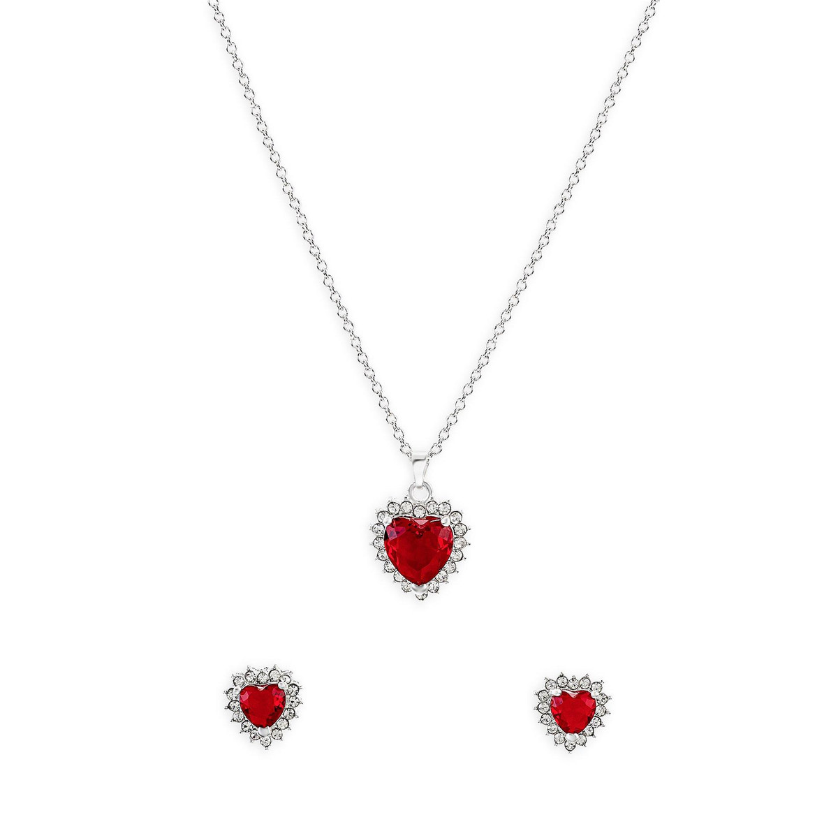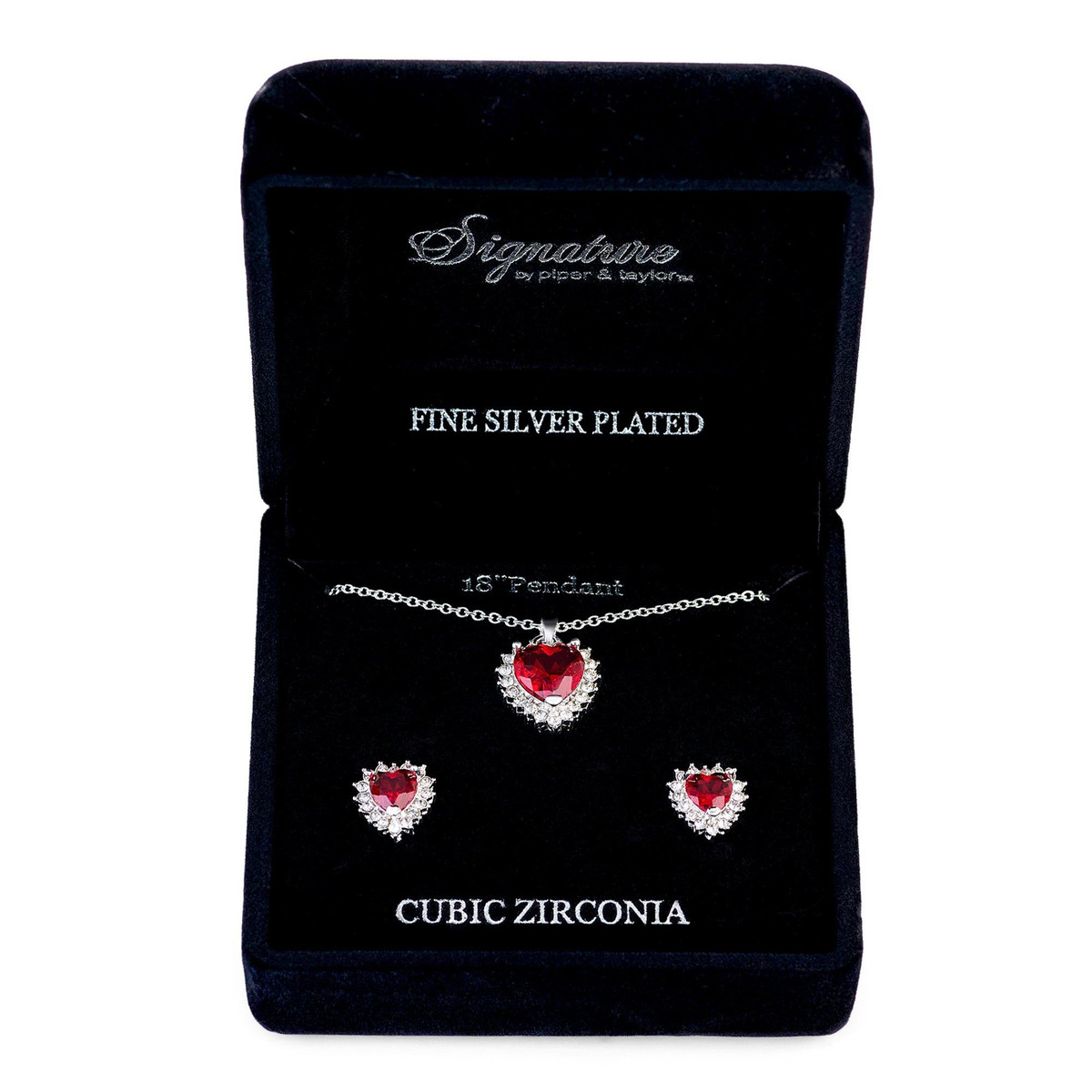 The Signature CZ Red Heart Necklace & Earrings Set features a striking red heart-shaped pendant, surrounded by sparkling cubic zirconia stones, paired with matching earrings for a coordinated look. The rich red hue of the heart adds a romantic touch, making it perfect for special occasions or gifting. Elegant and timeless, this set adds a pop of color and shine to any outfit, making it a beautiful addition to your jewelry collection.