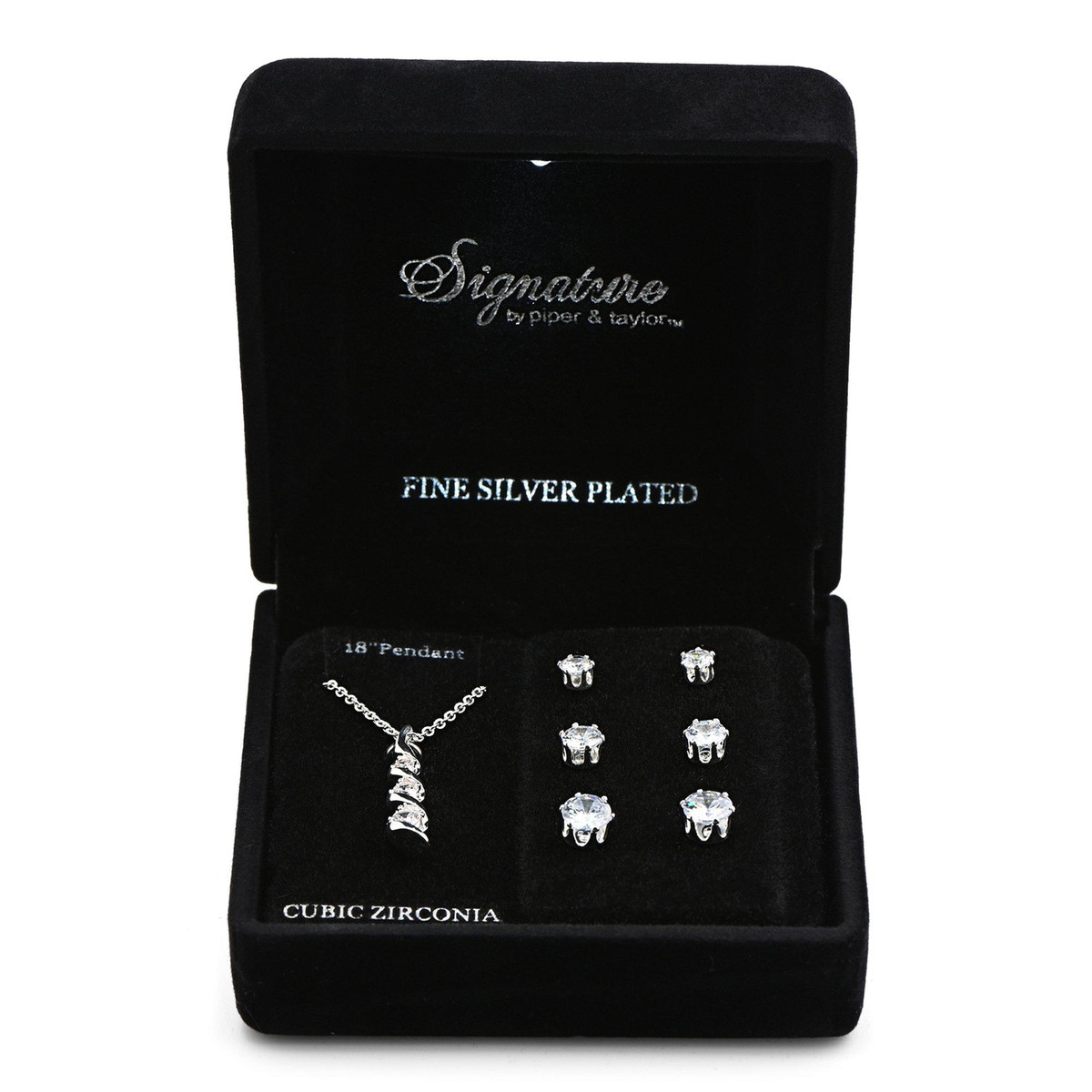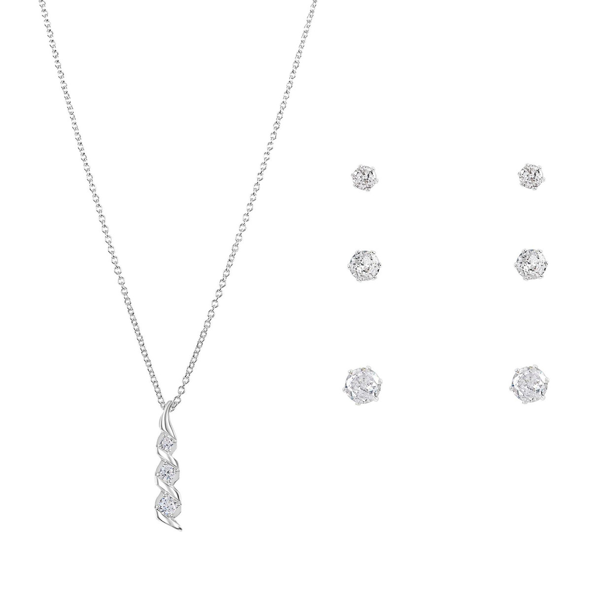 The Signature CZ Ribbon Necklace & 3-Pk. Earrings Set features an elegant ribbon-shaped pendant adorned with sparkling cubic zirconia stones, creating a refined and feminine look. The set includes three pairs of earrings: classic studs, stylish hoops, and graceful drop earrings, all designed to complement the necklace perfectly. This versatile set adds a touch of sophistication to any outfit and makes a beautiful gift or timeless addition to your jewelry collection.