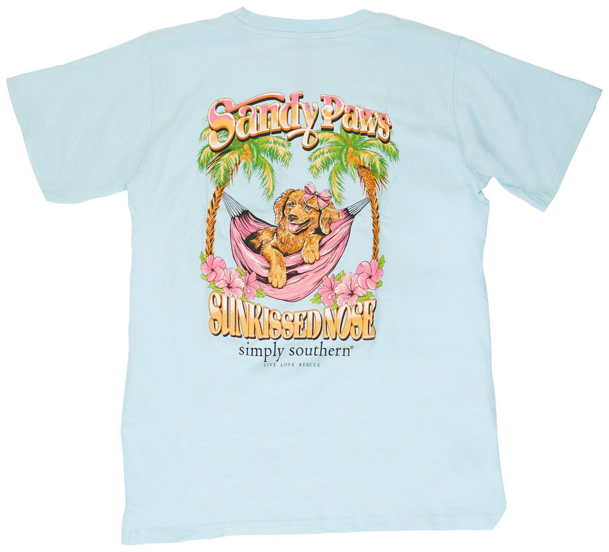 Bring the beach vibes wherever you go with the Simply Southern Sandy Paws Sunkissed Nose tee. Featuring a relaxed pup lounging in a hammock under palm trees, this ice blue shirt captures the carefree spirit of summer. Made from soft 100 percent cotton with a classic crew neck and short sleeves, it is perfect for dog lovers and sun chasers alike. Wear it and let your style say vacation mode is always on.