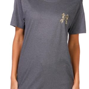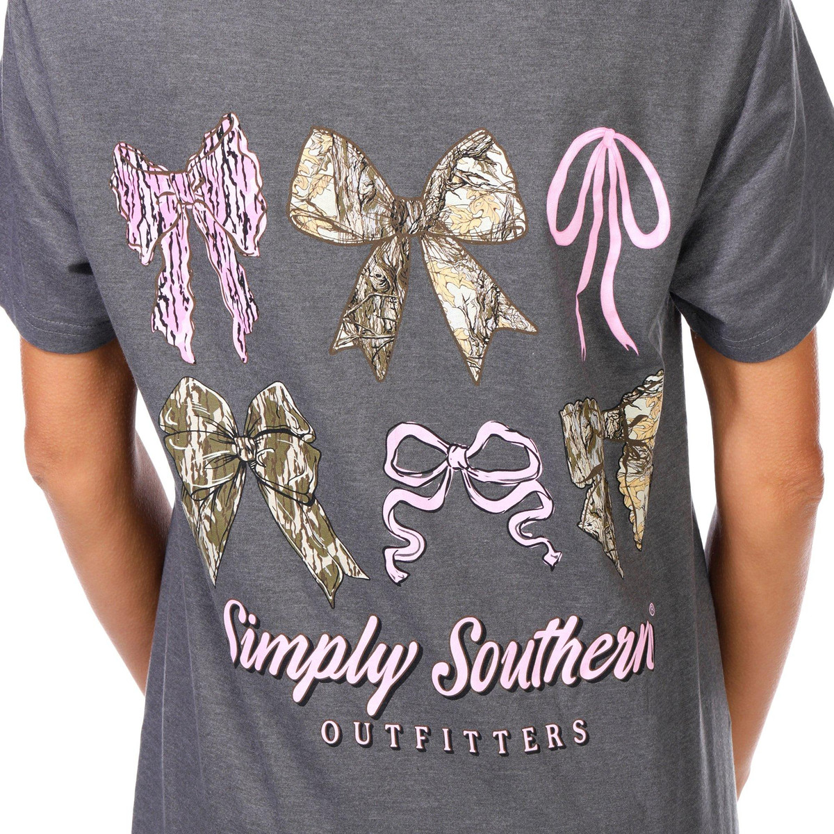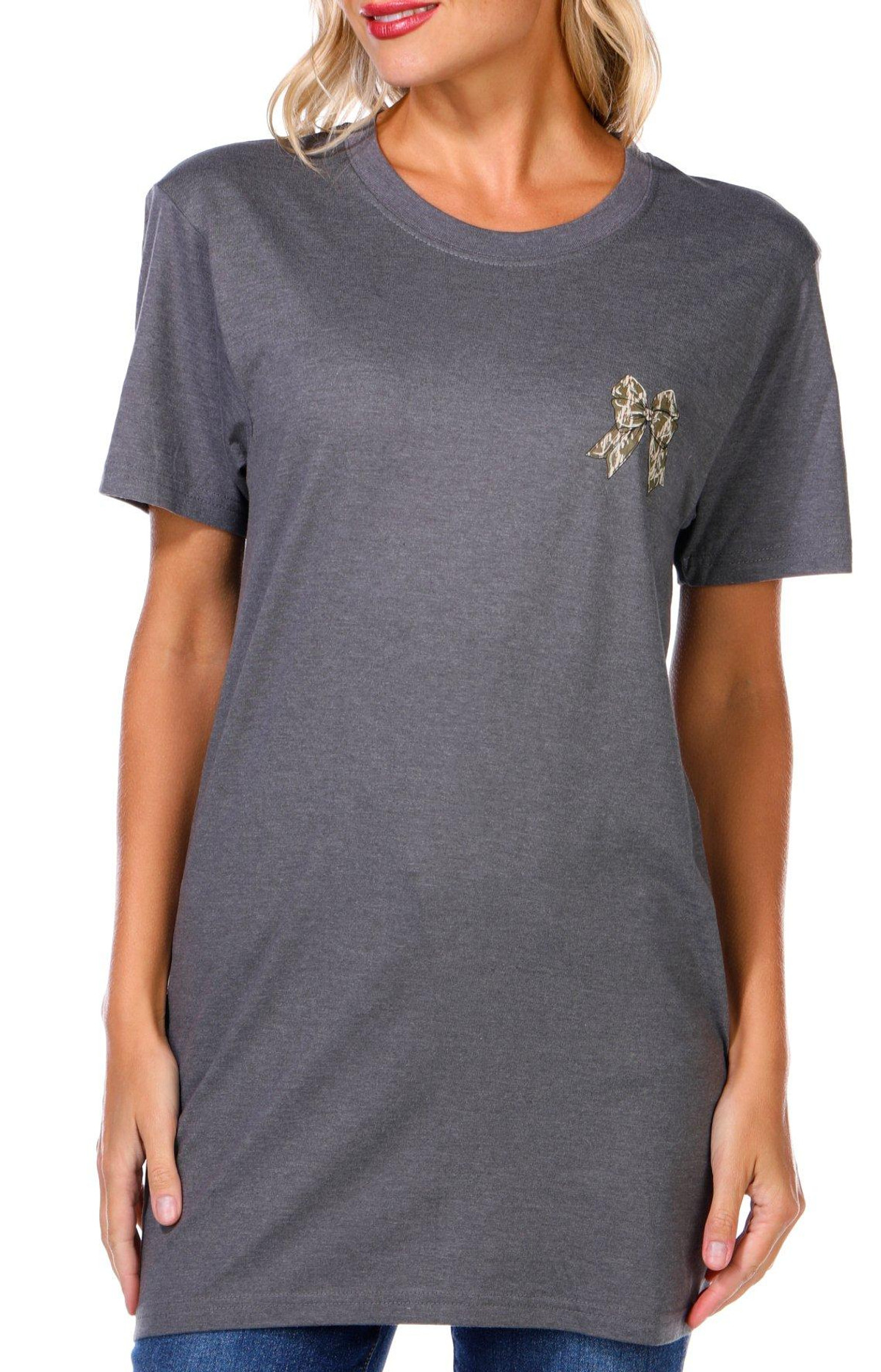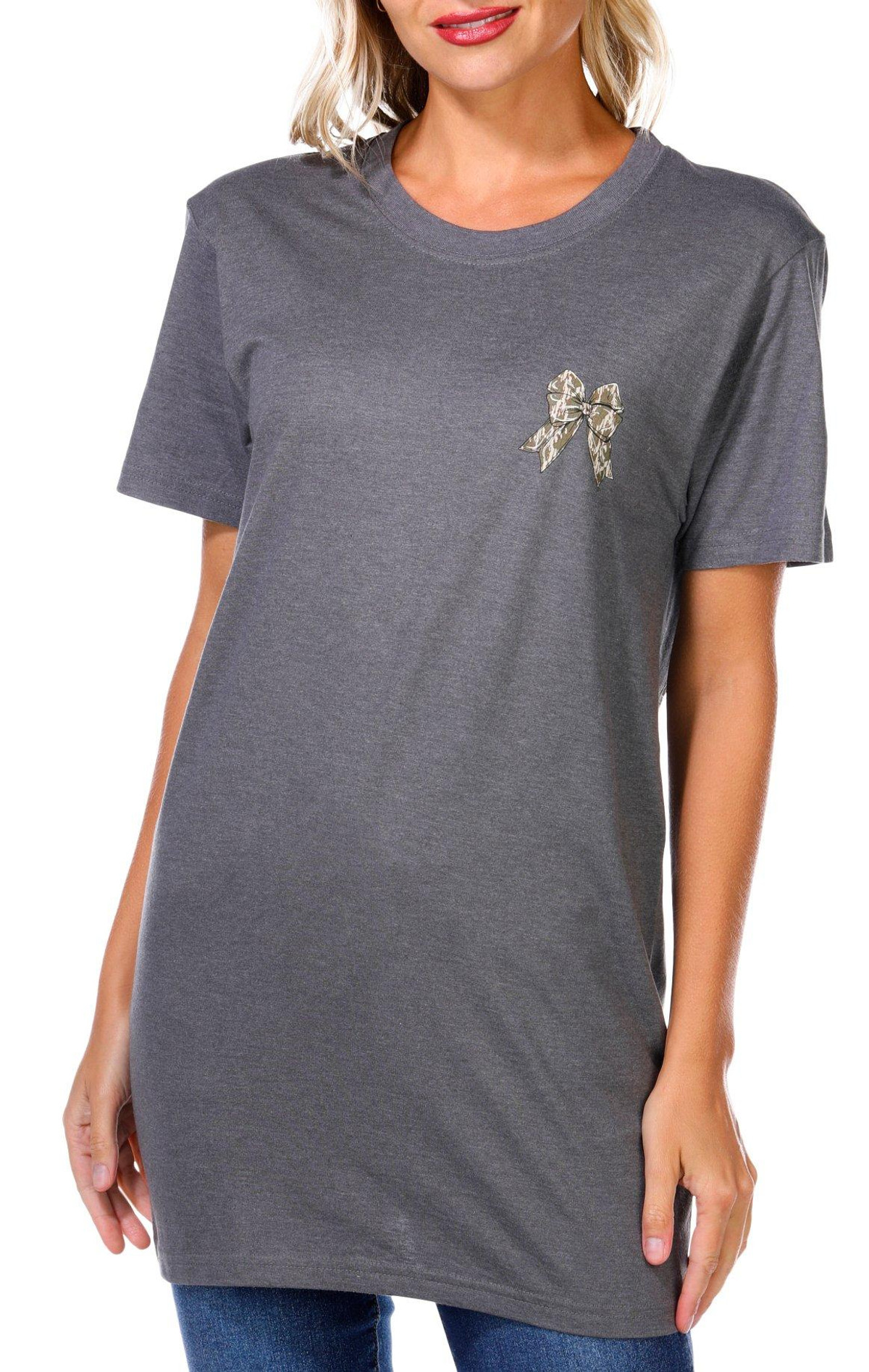 The Juniors Camo Bow Graphic Tee adds a playful twist to casual wear, featuring a classic crew neckline, short sleeves, and subtle brand script on the chest corner. A cute bow graphic on the back brings a fun, feminine touch to this laid-back essential. Fabrication 100% cotton