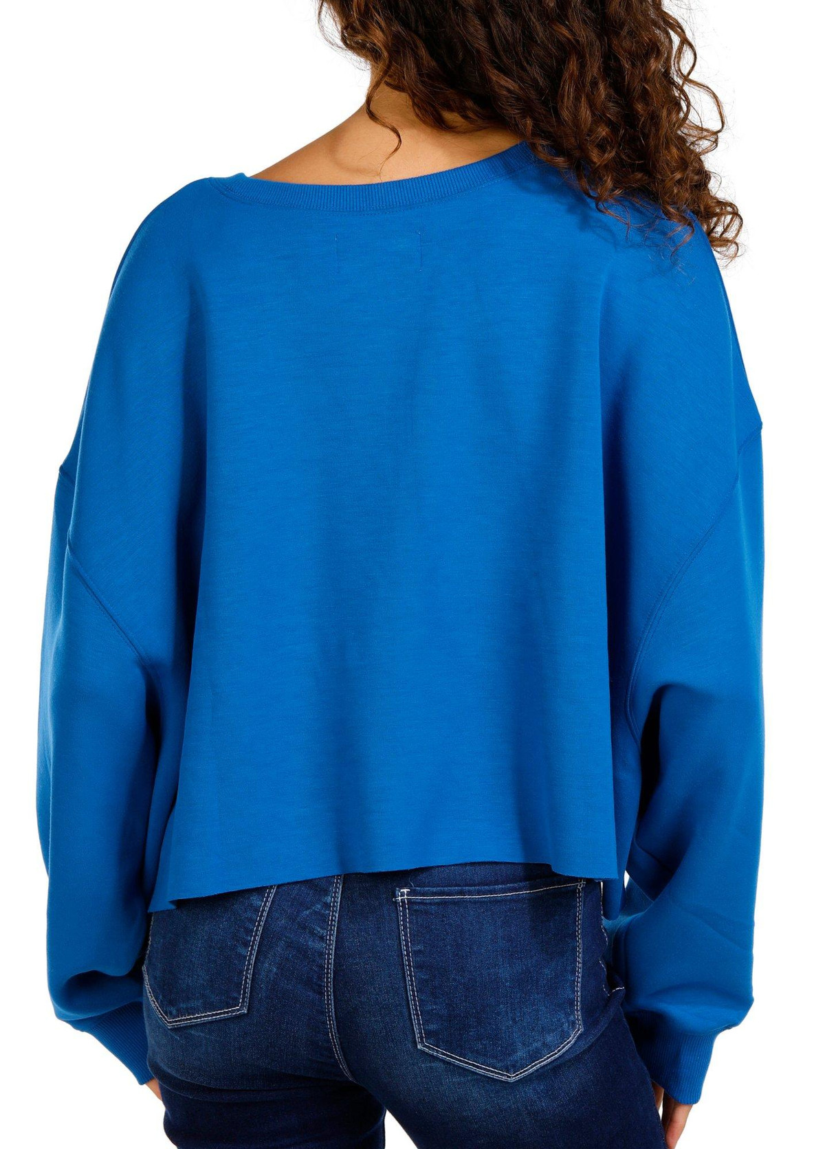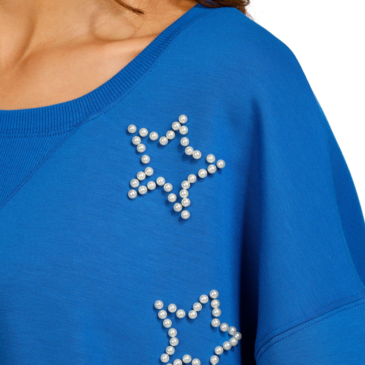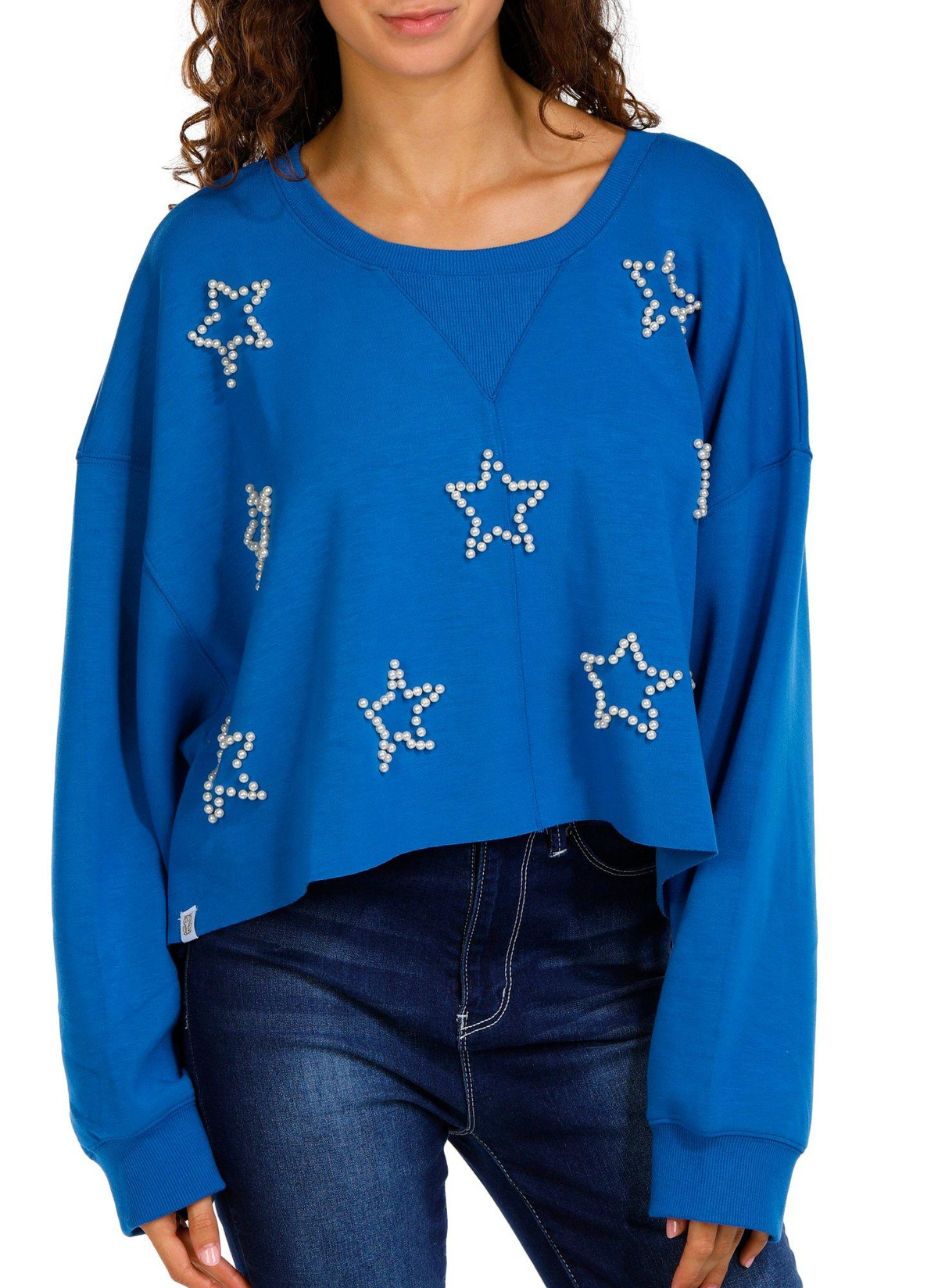 This long sleeve sweater features elegant pearl embellishments that add a touch of sophistication. Soft and cozy, its perfect for elevating your cool weather wardrobe. Fabrication is 48% modal, 48% polyester, 4% spandex.