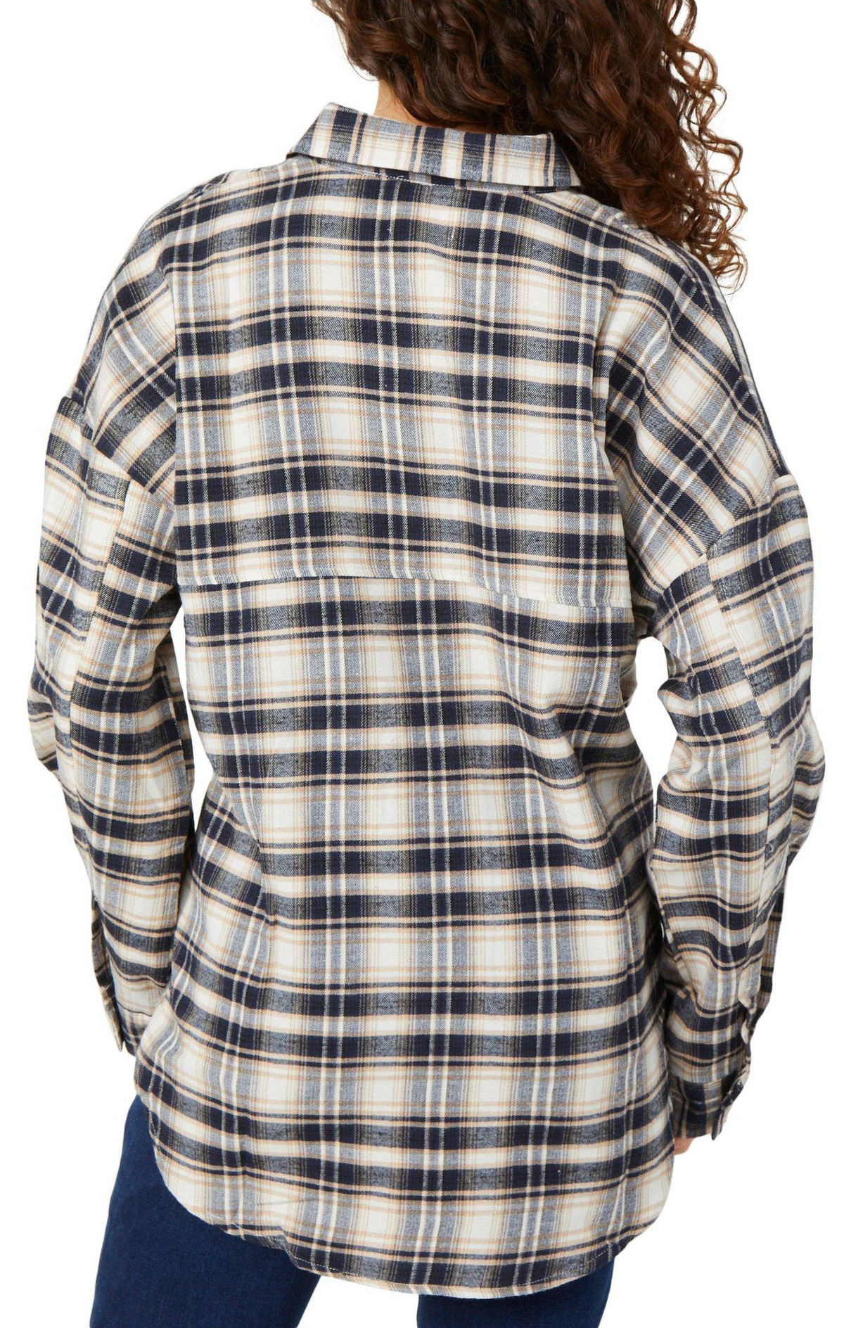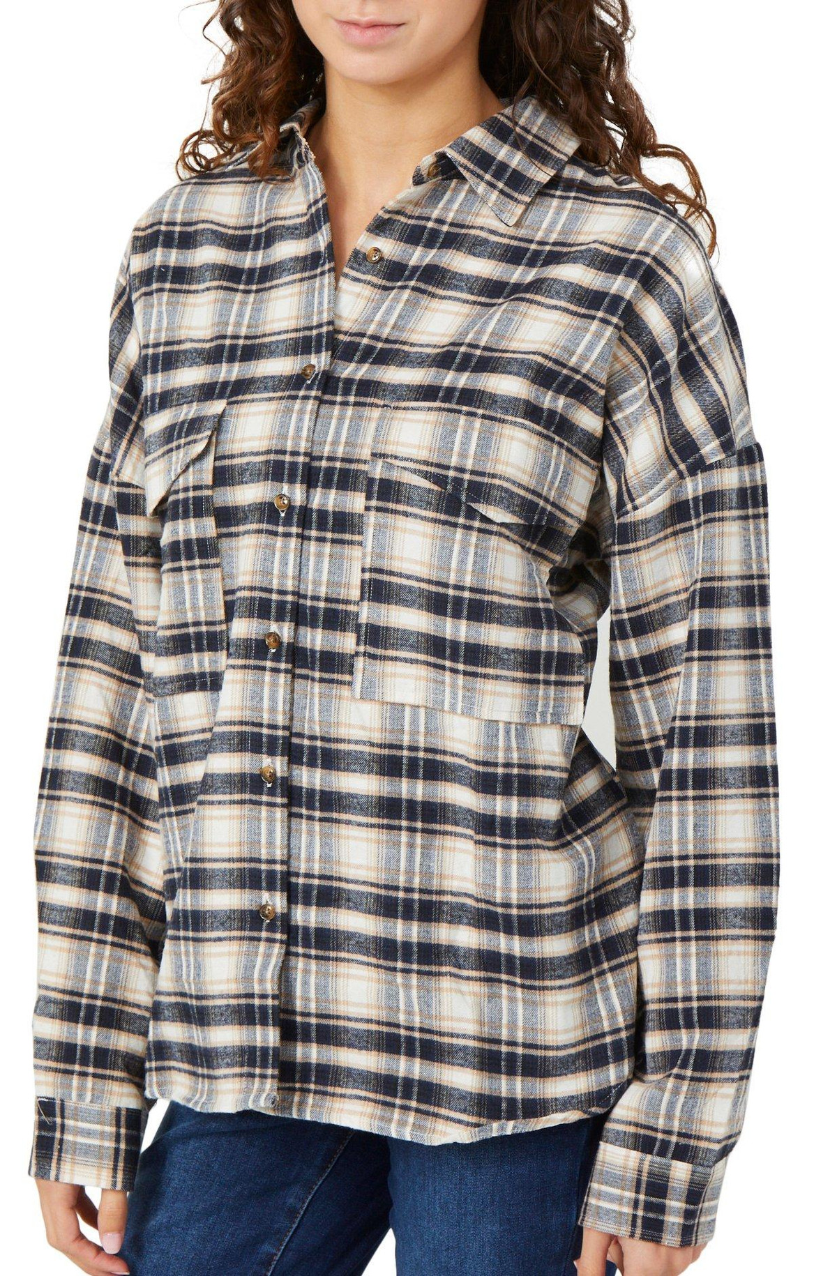 Layer up in effortless style with the Juniors Plaid Shacket. Featuring a timeless plaid pattern, this versatile piece includes long sleeves, a classic collar, and a button-down front closure. Fabrication 50% cotton, 50% polyester