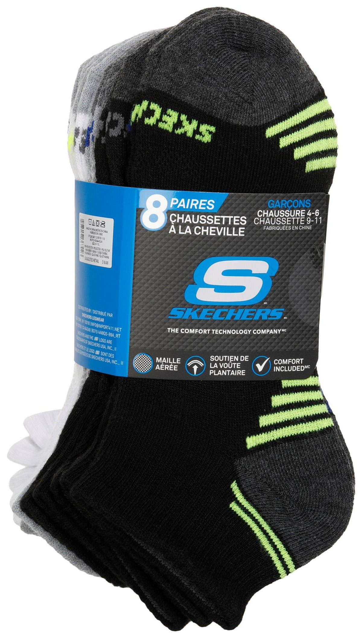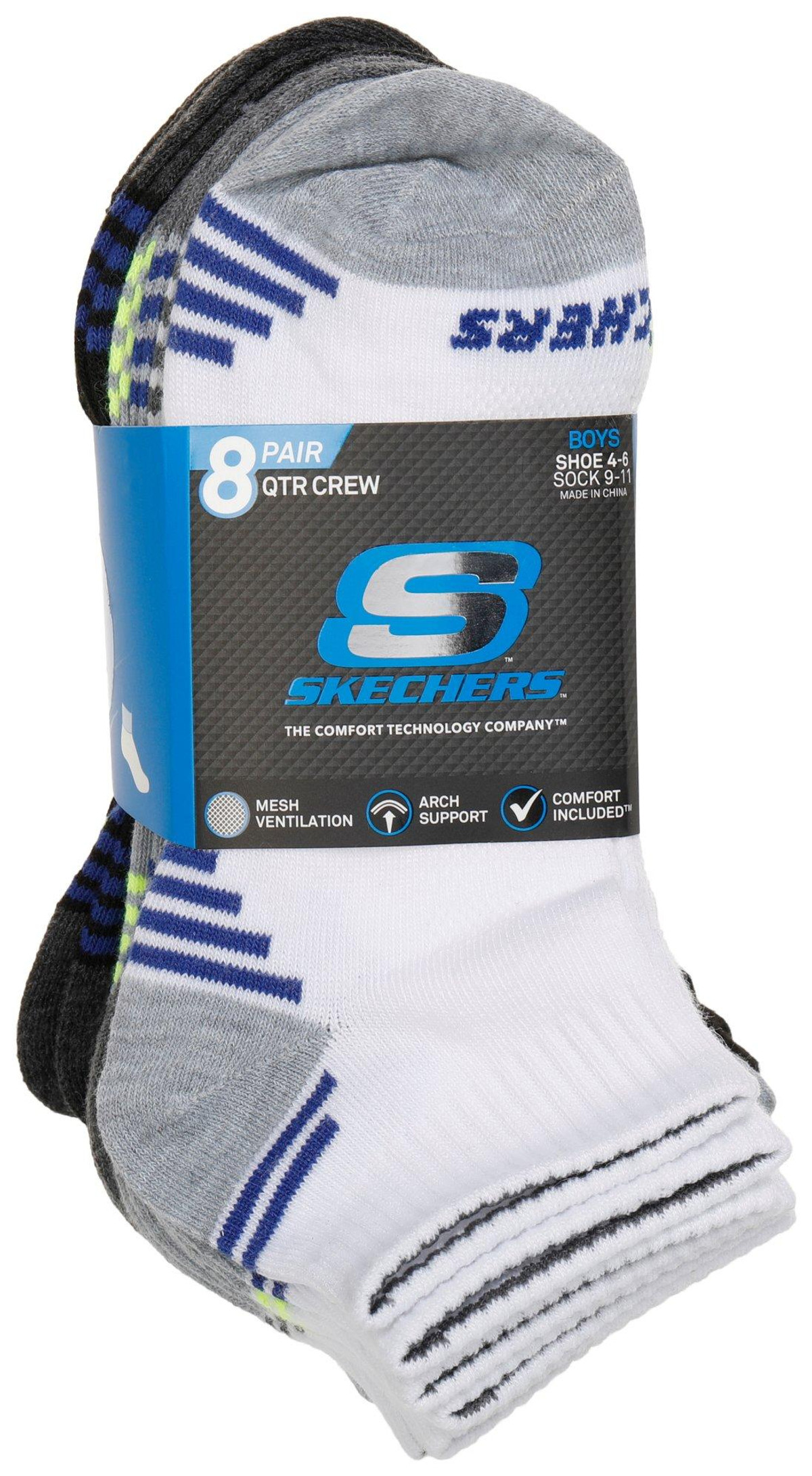 This Boys 8-Pack Quarter Crew Socks set features mesh ventilation for breathability and built-in arch support for all-day comfort. Made from a durable blend of polyester, rubber, and spandex, theyre perfect for active kids on the go.
