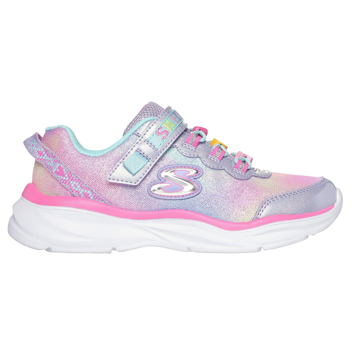 These Skechers Girls Power Jams Skech Friends Athletic Shoes have an easy pull on style with a man made fabric upper. The lightweight ribbed sole offers cushioned traction.
