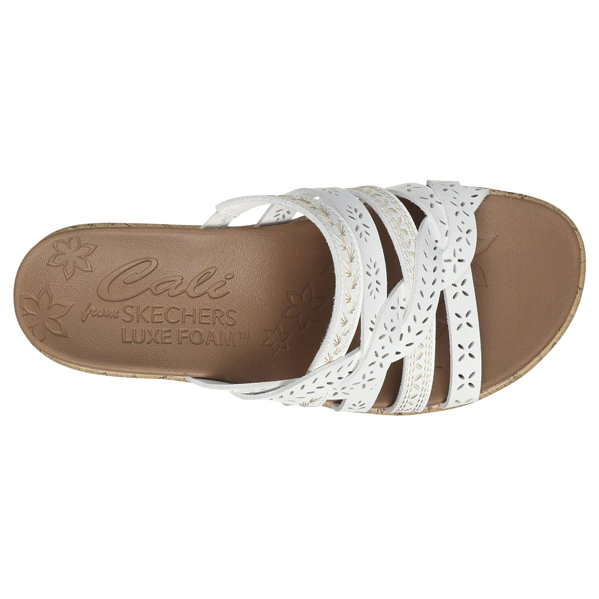 Summery style and absolute comfort combine in Skechers Beverlee Resort wedge sandals. This strappy vegan wedge sandal features an embroidered and laser-cut synthetic upper with an adjustable back strap and a cushioned Luxe Foam footbed.