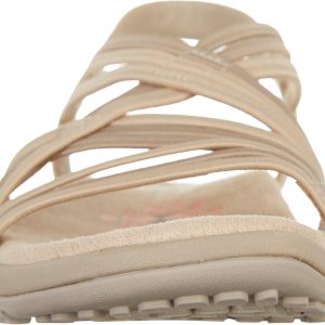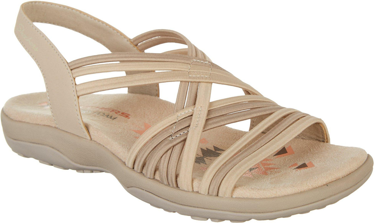 Stretch out and enjoy the sunny days in style with the SKECHERS Reggae Slim – Simply Stretch sandal. Soft stretch fabric and synthetic upper in a sporty casual slingback strappy slide sandal. Memory Foam footbed.