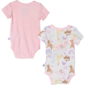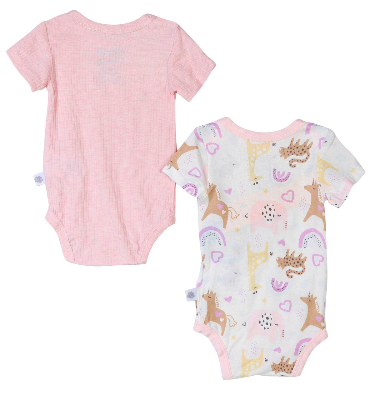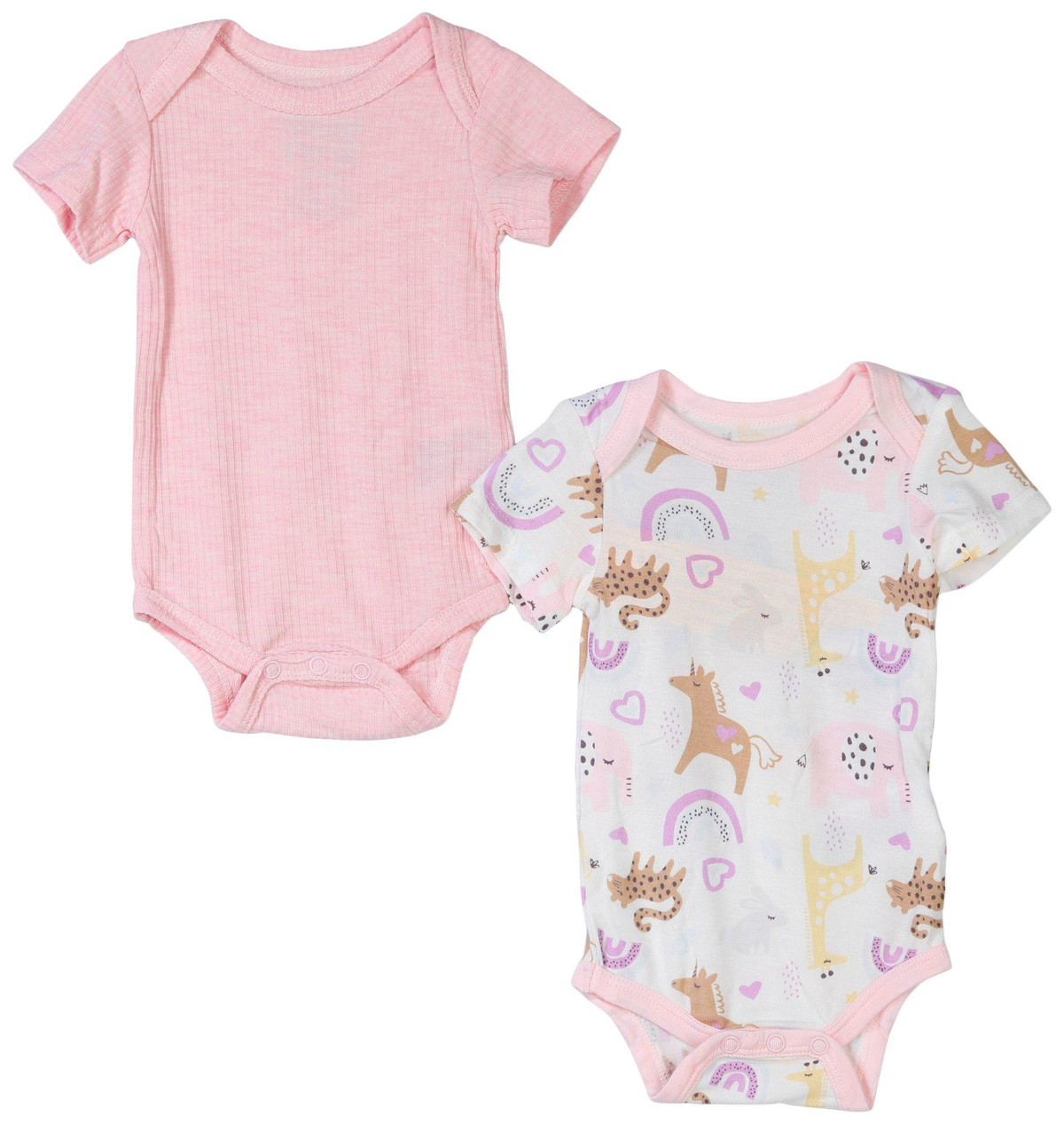 This baby girl two pack bodysuit set includes one in a soft ribbed solid color and another with playful unicorn giraffe and rainbow prints. Both feature bottom clasps for quick and easy changing, combining comfort with whimsical charm.