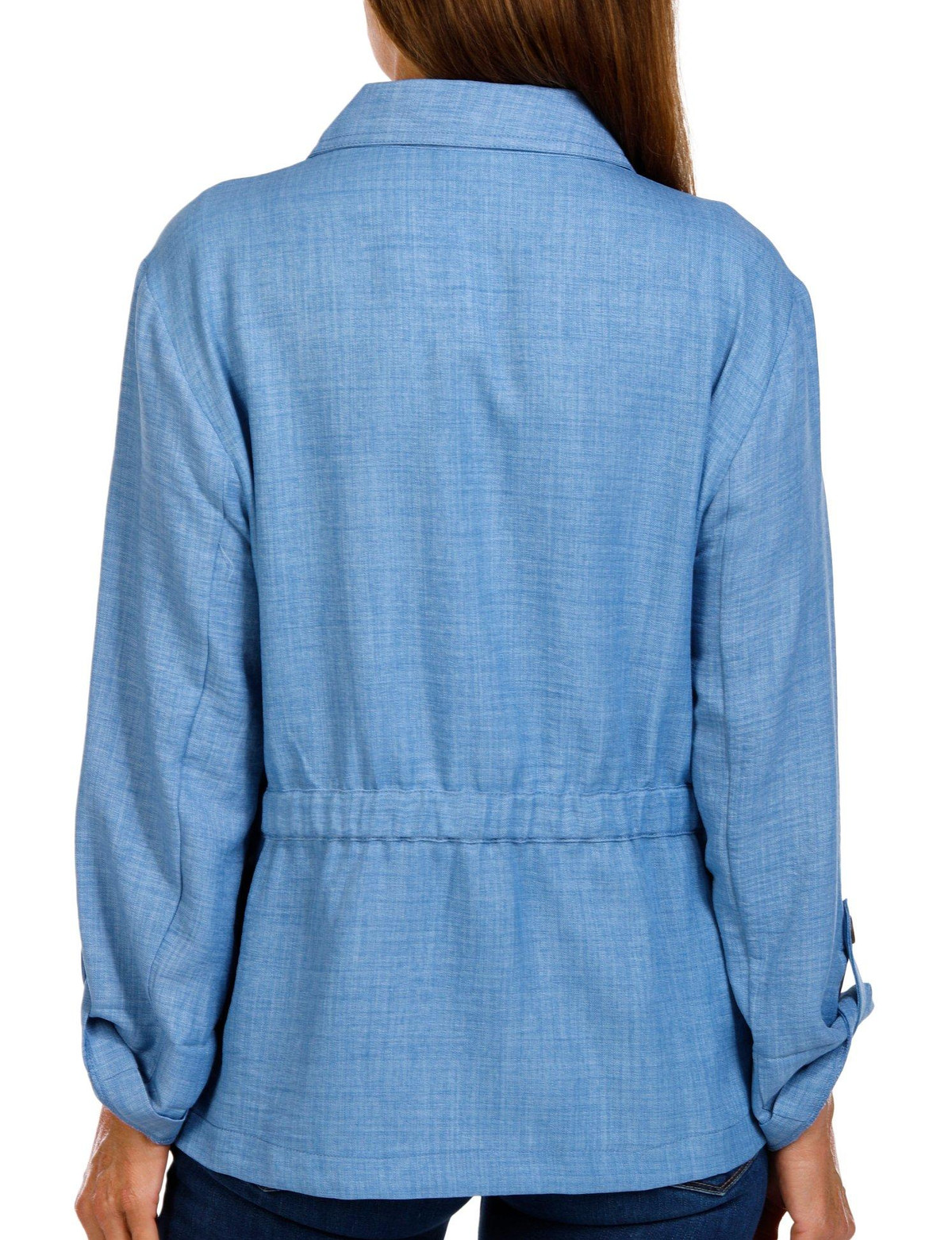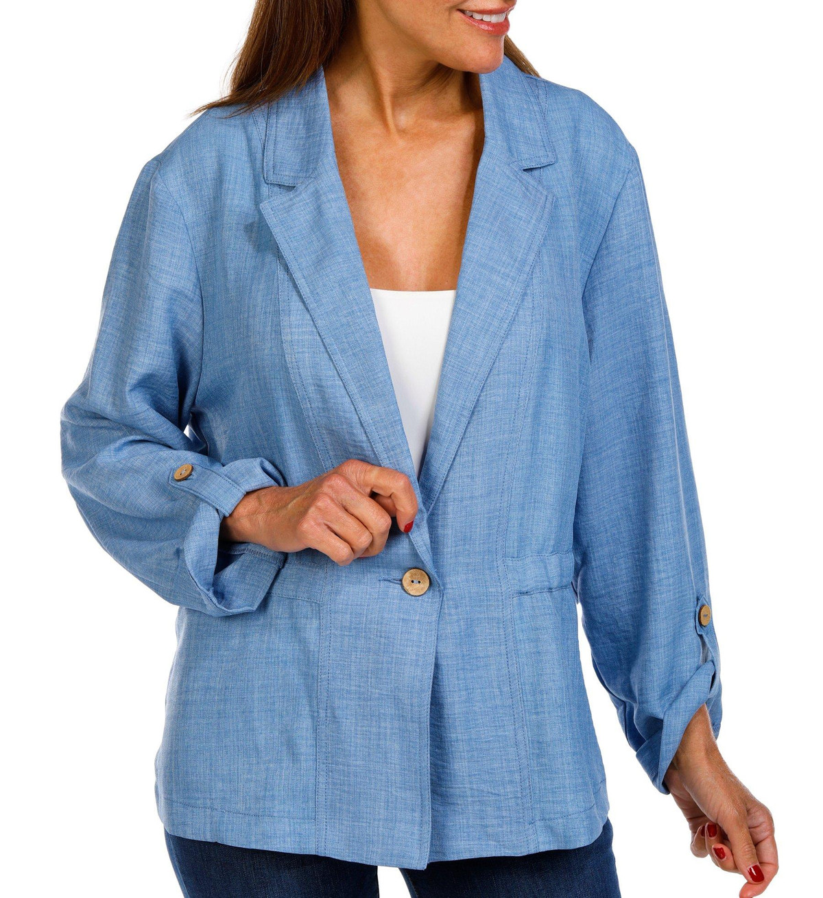 Effortlessly elevate any outfit with this polyester jacket featuring a sleek single-button front and flattering elastic waistline. Designed with stylish 3/4 roll-tab sleeves and a solid color for versatile wear, it blends structure and comfort for a polished look that works from desk to dinner. Ideal for layering across seasons while keeping your style sharp and modern. Length measures approximately 28 in. Fabrication is 100% polyester.