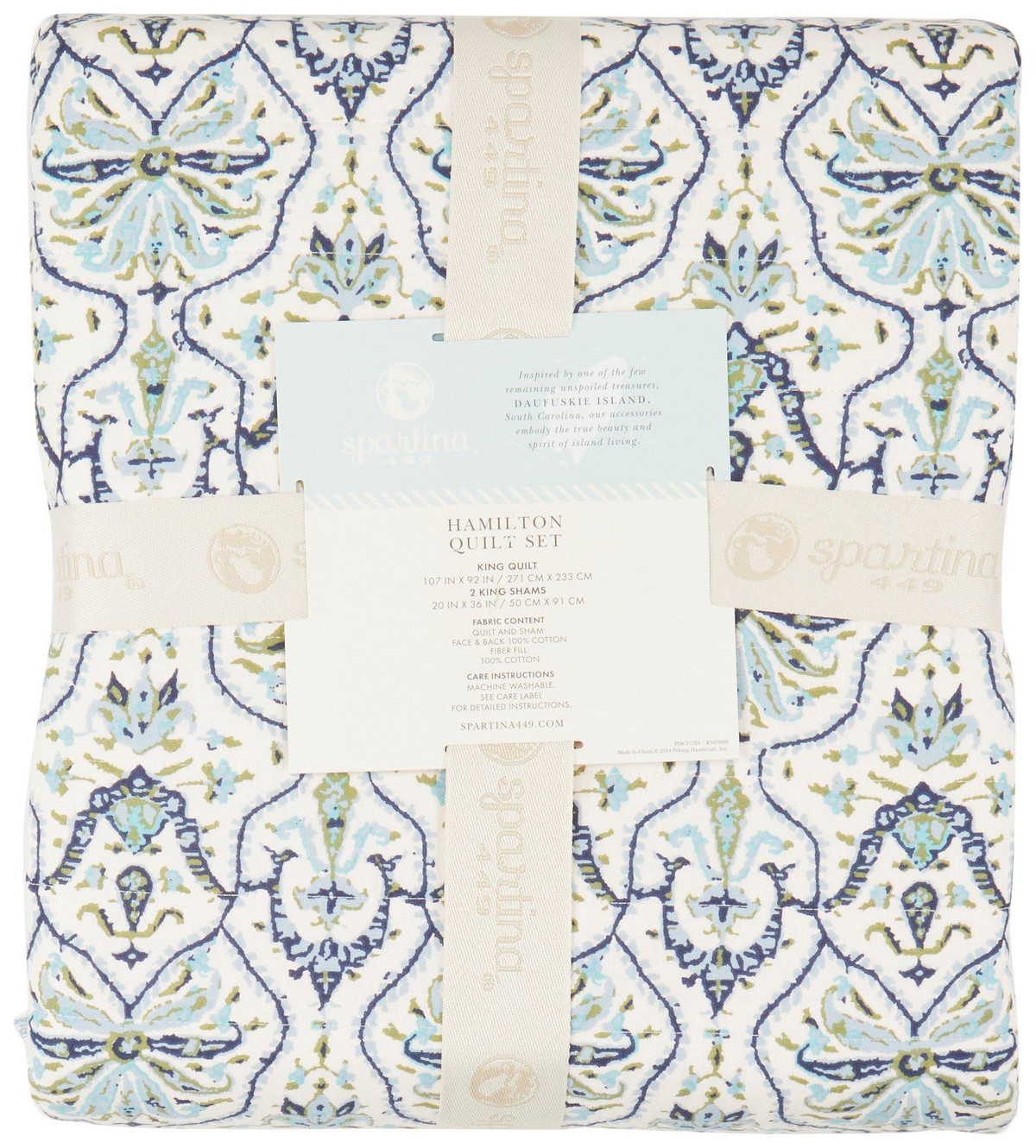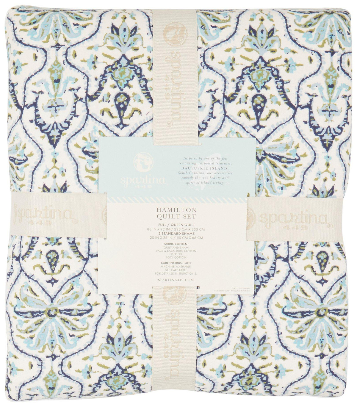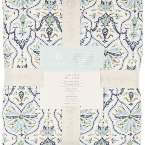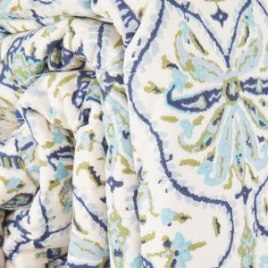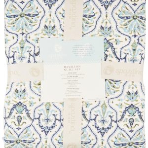 Elevate your bedroom with the timeless elegance of the Hamilton Quilt Set. Featuring a blue and green damask pattern on a soft cream background, this lightweight, 100% cotton quilt is reversible with a delicate botanical print on the back. Complete with coordinating pillow shams framed in a striped fringe, it offers breathable comfort and year-round style.