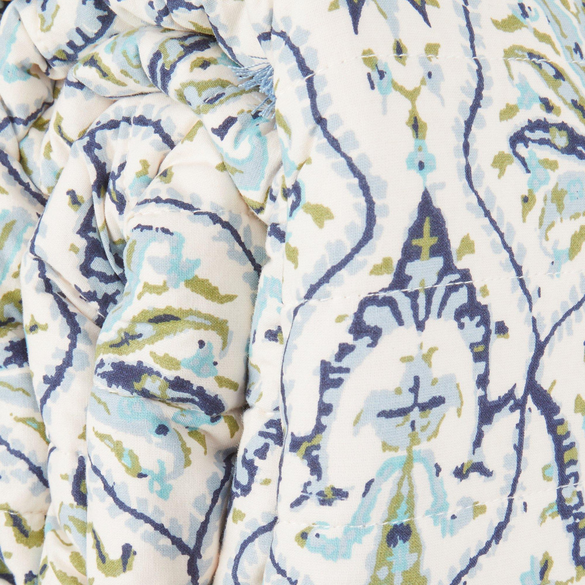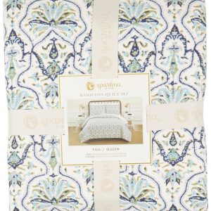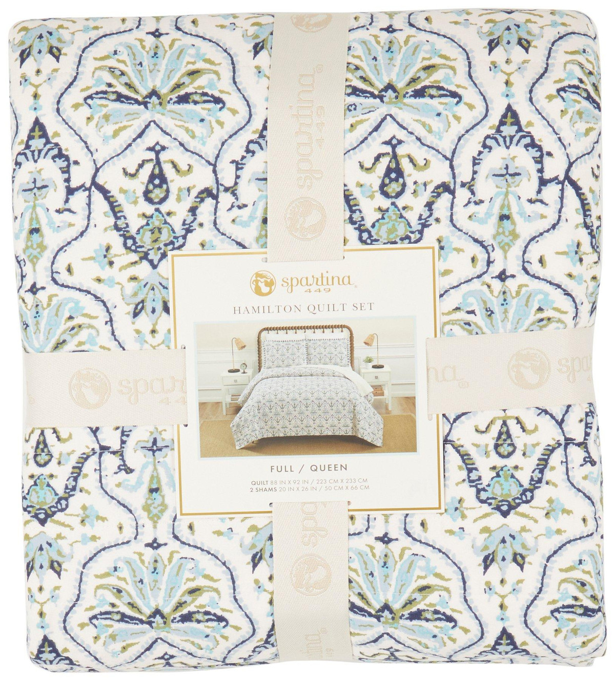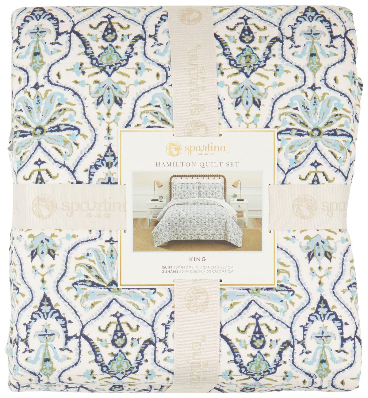 Elevate your bedroom with the timeless elegance of the Hamilton Quilt Set. Featuring a blue and green damask pattern on a soft cream background, this lightweight, 100% cotton quilt is reversible with a delicate botanical print on the back. Complete with coordinating pillow shams framed in a striped fringe, it offers breathable comfort and year-round style.