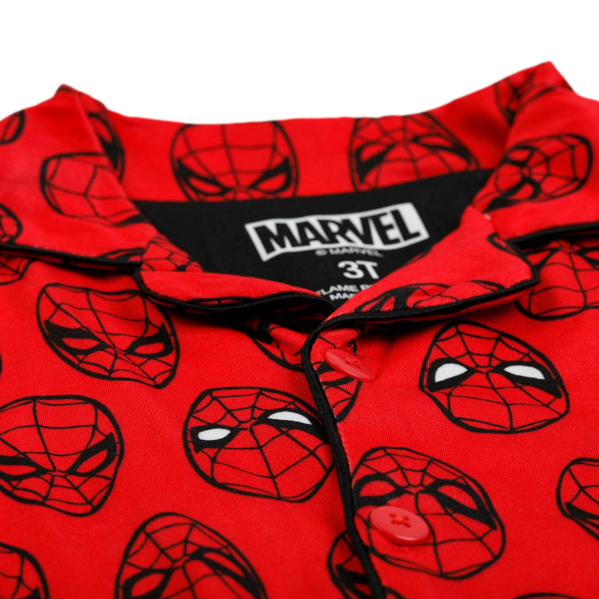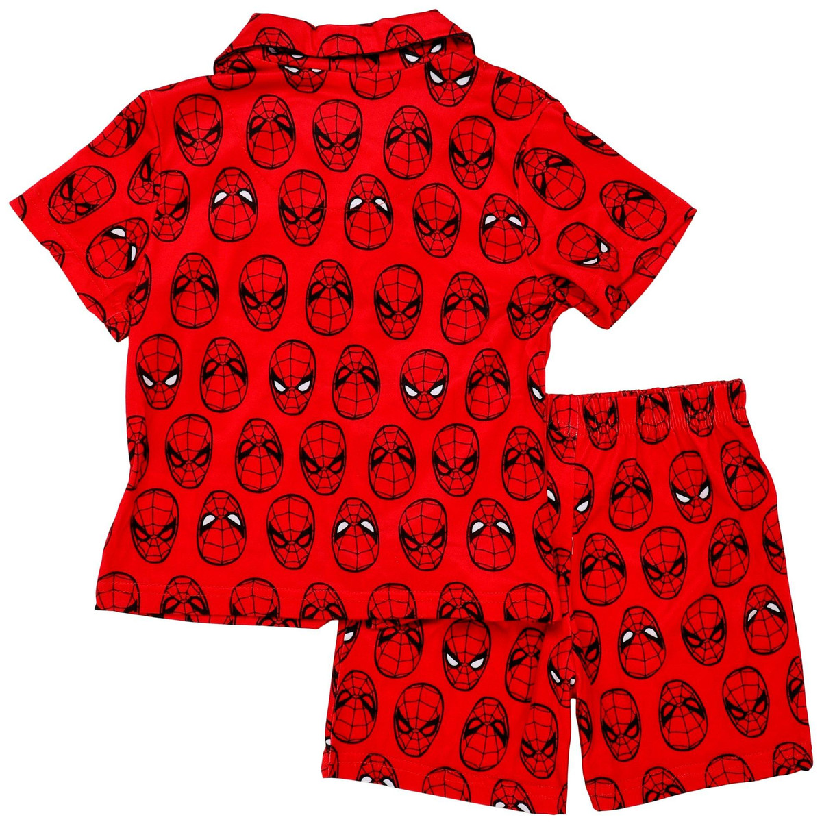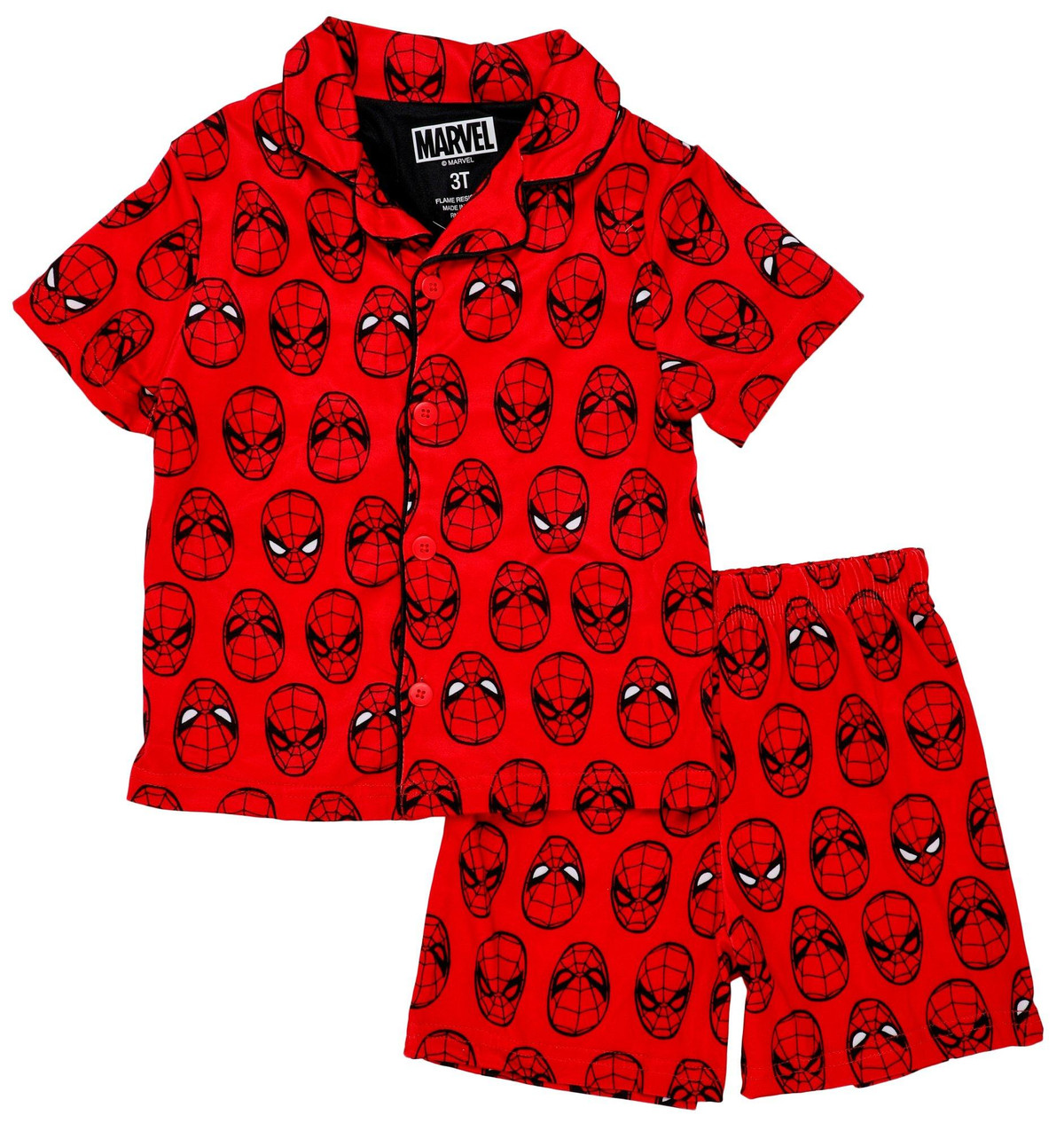 Your little superhero will love bedtime with this Toddler Boys 2 Pc Button Down Pajama Set! Made from a premium blend of polyester/spandex, this set includes a comfy, button down, short sleeve shirt and matching shorts, both featuring vibrant Spider-Man graphics. Perfect for warm nights, the lightweight fabric ensures a cozy and breathable fit. Let your child swing into sweet dreams with their favorite web-slinger by their side! Fabrication is 95% polyester, 5% spandex.