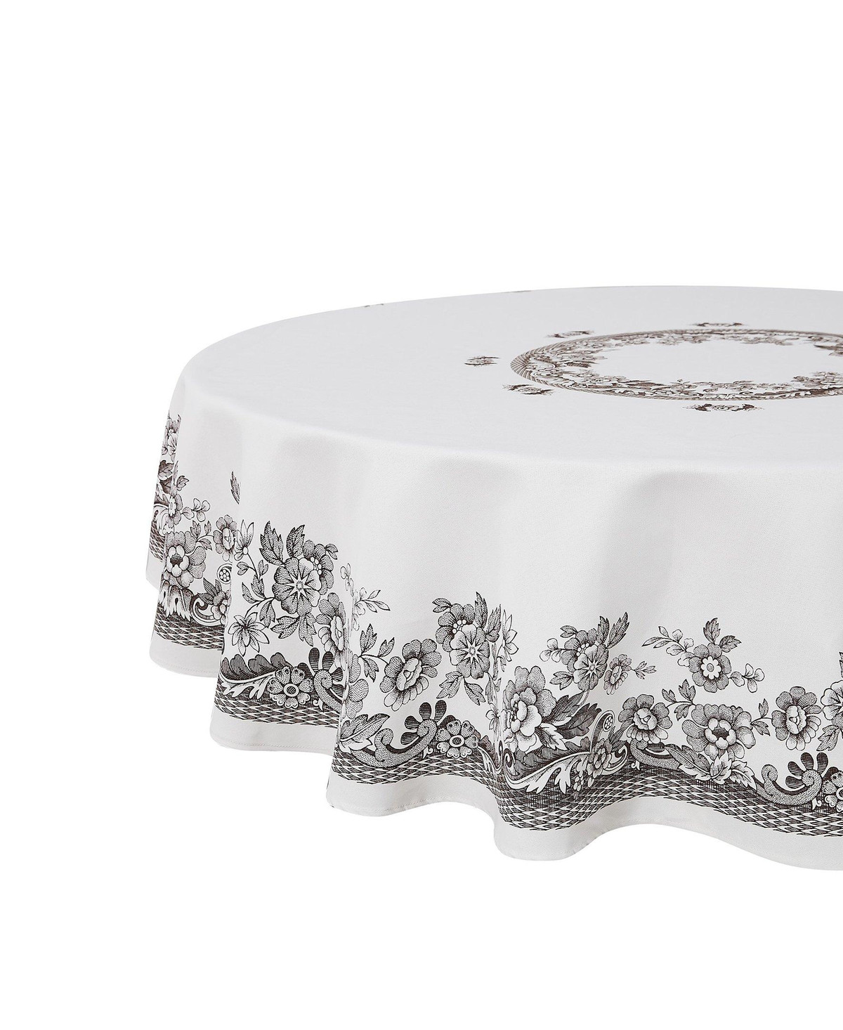 The Spode Woodlands 70 in. Round Tablecloth features an intertwining engineered border of flowers and scrolls known as British Flowers that dates back to 1831. The center panel is a double border with flowers and leaves in the middle. Printed in rich brown on an ivory ground, 100% polyester cloth.