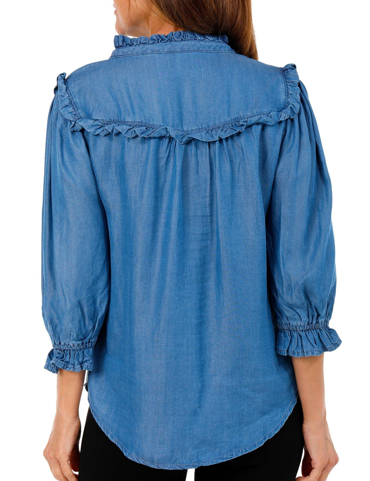 This petite button down top features a stylish chambray exterior with a flattering fit. The three quarter ruffle sleeves add a feminine touch while the button front design brings classic charm to this versatile wardrobe piece. Fabrication 100% lyocell