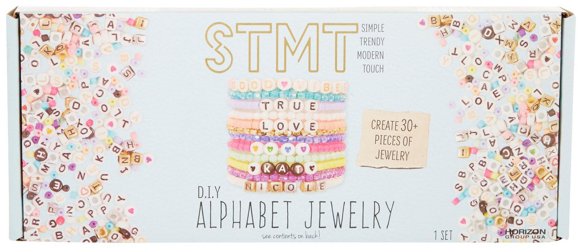 Keep her fashionable with this friendship bracelet set by STMT. Includes 204 round alphabet beads, 136 cube alphabet beats, 15 heart beads, 300 round faceted beards w AB finish, seed beads, tubular elastic cords, 100 round faceted metallic beads and instructions.