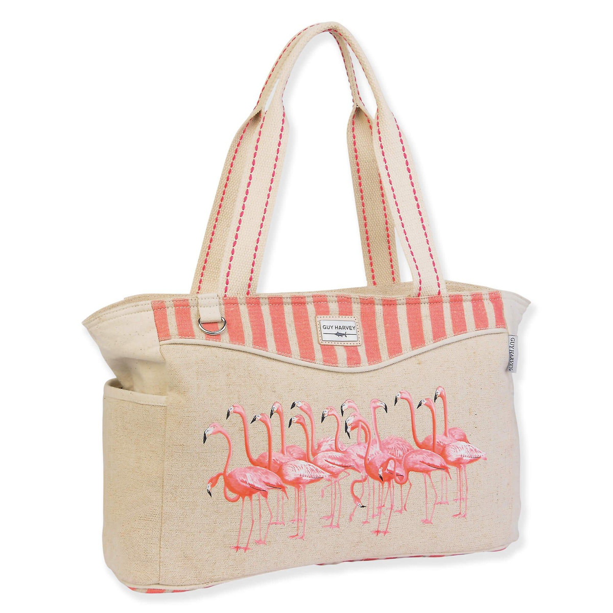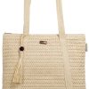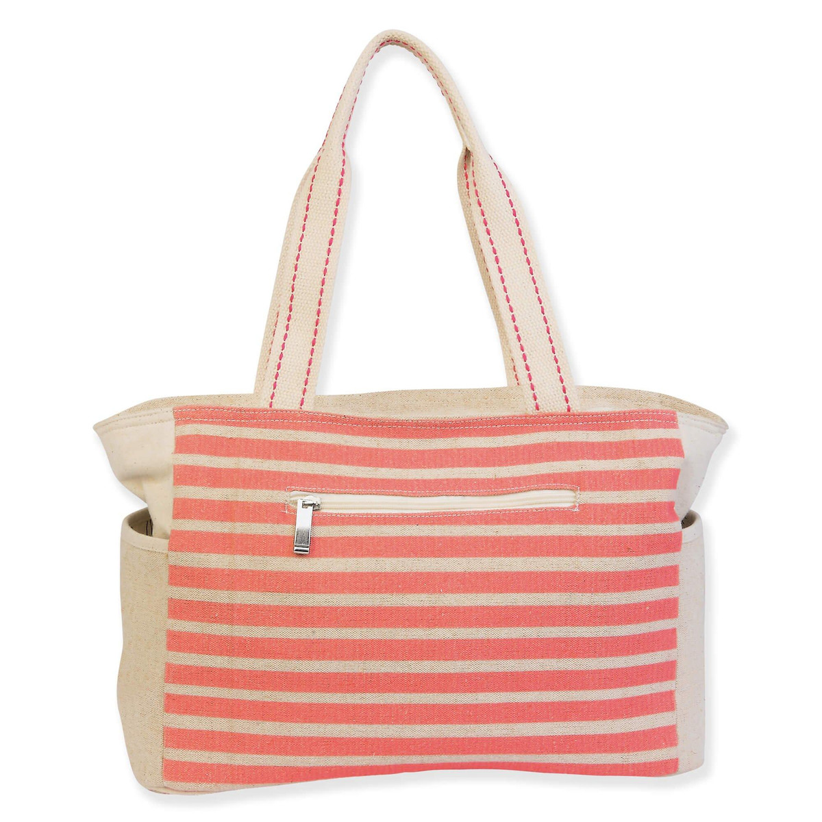 This Beach Shoulder Tote features a stylish pattern and cute design on a woven fabric with dual handles, and a top zipper closure. The lined interior contains one zipper pocket and a slip pocket. Measures approximately 18 in. x 14 in.