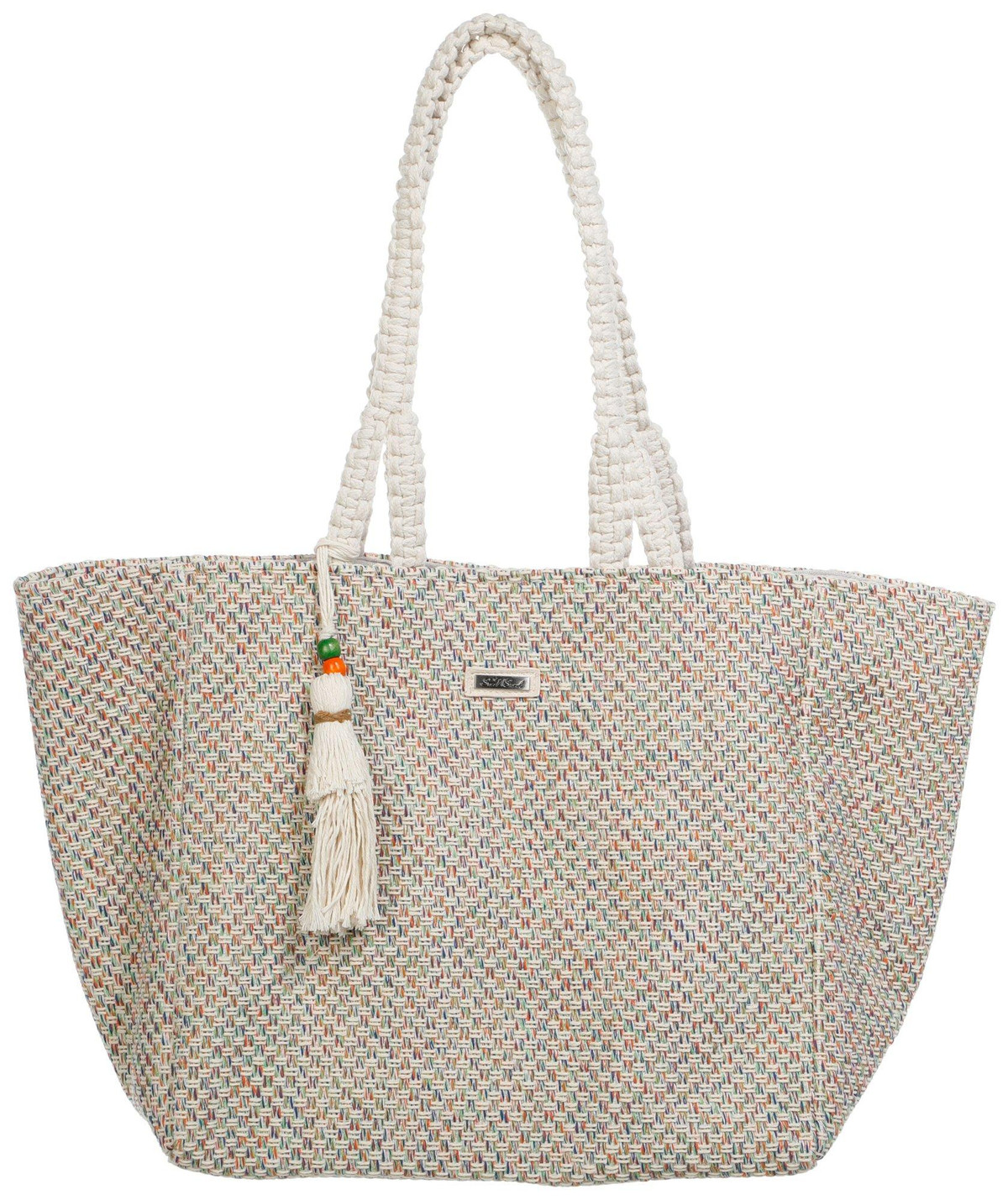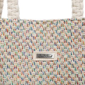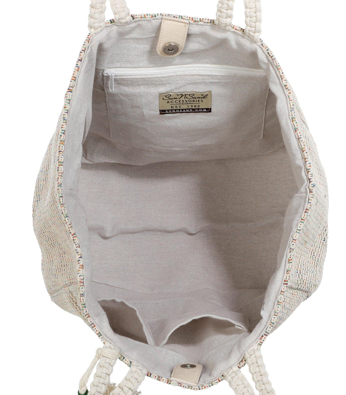 Sunshine meets sophistication in this beautifully crafted beach tote shoulder bag, designed for both style and function. Featuring comfy shoulder straps, a secure snap top, and a spacious interior, it keeps your essentials organized with a zippered pocket and two open pockets. Includes a matching tassle for a stylish accent. Whether you’re seaside or city-bound, this tote is your perfect sunny-day companion. Measures approximately 14 in x 13 in x 8.5 in.