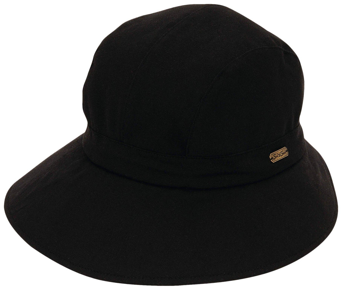 This cloche hat features a classic style in a solid color design, flexible cotton fabrication, interior drawstring sizer for adjusting fit, and UPF 50+ sun protection in covered areas. Brim has a tapered shape with the largest front measurement approximately 3.5 inches.