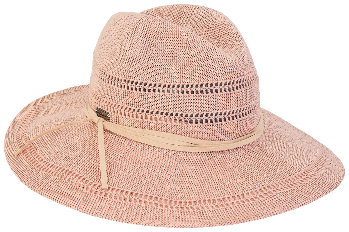 This Parker Safari Hat features a solid color design on a polyester braid fabrication, a pinched crown, a cord hatband with side tie, an interior size adjuster, and a wide brim. Brim measures approximately 3.25 in.