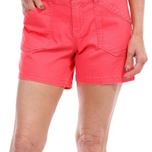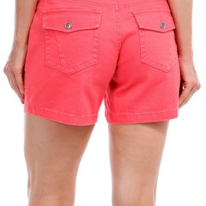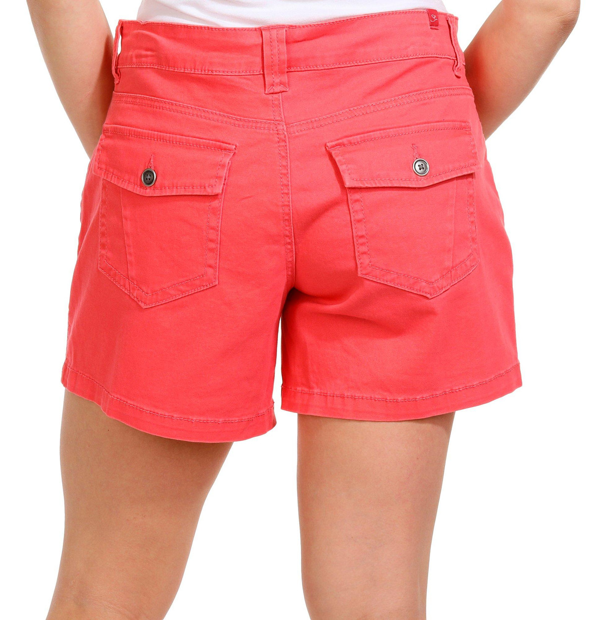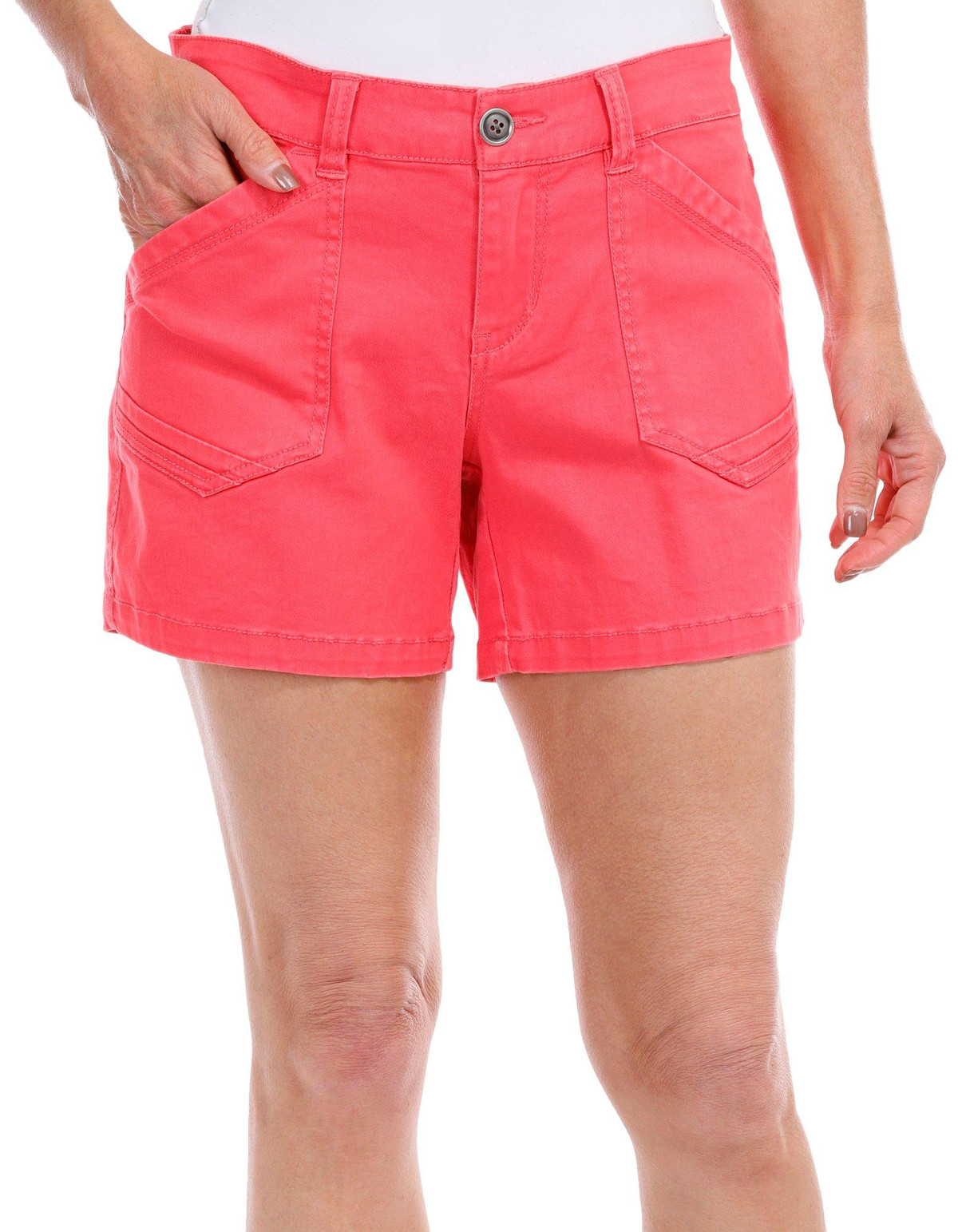 These Alix shorts feature a solid color design on lightweight stretch fabric, two front pockets, two back button-flap pockets, and fashionable seam detailing. The inseam measures approximately 5 in. Fabrication 96% cotton and 4% spandex.