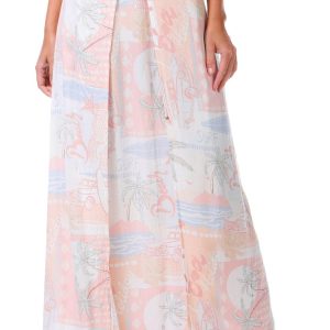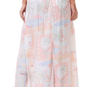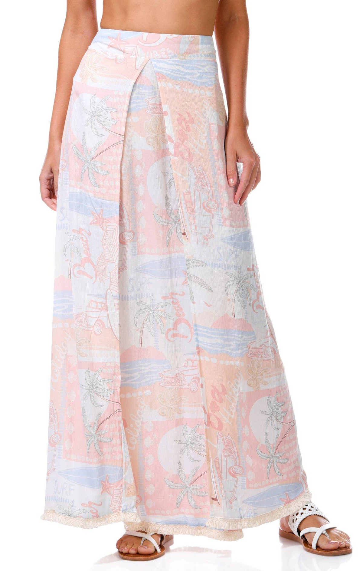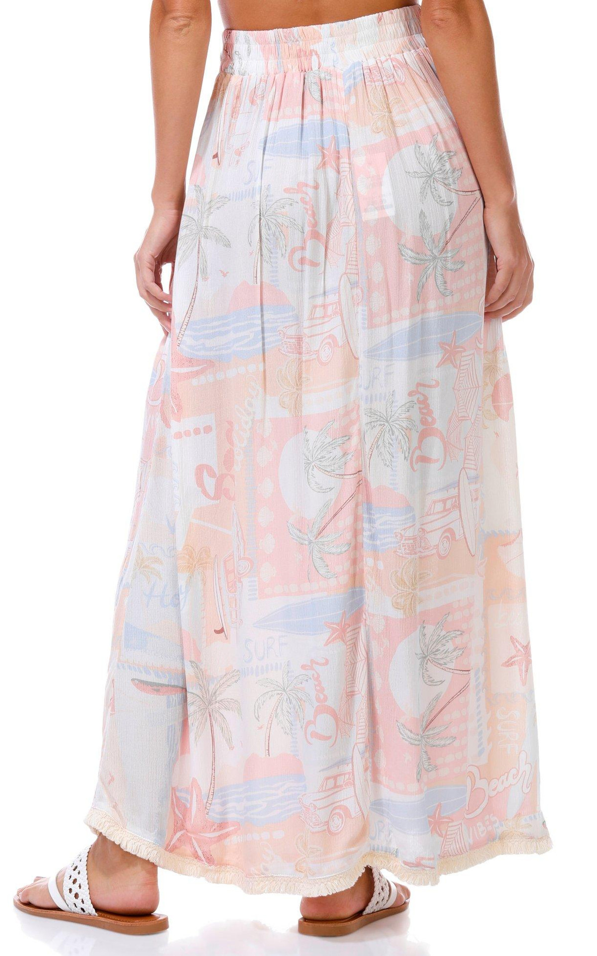 This juniors maxi skirt brings vacation vibes with its playful postcard print and breezy silhouette. The elastic waistband offers comfort while the front slit adds a flirty touch. Perfect for sunny days and effortless style. Fabrication 100% rayon